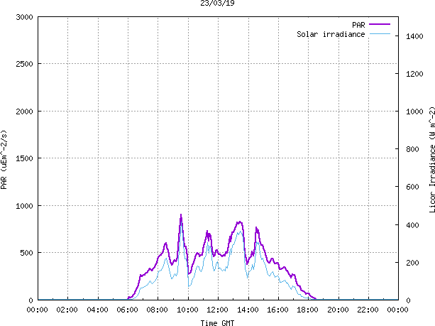 The PML meteorological station, situated on the south-west corner of the building roof, consists of a Hygroclip S3 temperature and humidity sensor housed in a radiation shield, a Mierij Meteo solid state wind sensor (MMW-005), a Chelsea instruments half-hemisphere PAR sensor, a Li-Cor pyranometer (LI-200SZ) and an Omni Instruments 6" tipping bucket raingauge (RG200). The data are logged every 5 minutes using a Pace Scientific XR5 data logger. The real-time rainfall data is likely in error - the correct values will be displayed after a time lag of approximately 24 hours. The meteorological station is sheltered from winds in the north-east and underestimates winds from this quarter. To use these data please contact Dr Tim Smyth.