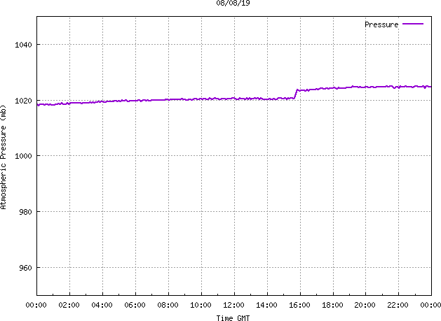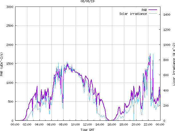 The PML meteorological station, situated on the south-west corner of the building roof, consists of a Hygroclip S3 temperature and humidity sensor housed in a radiation shield, a Mierij Meteo solid state wind sensor (MMW-005), a Chelsea instruments half-hemisphere PAR sensor, a Li-Cor pyranometer (LI-200SZ) and an Omni Instruments 6" tipping bucket raingauge (RG200). The data are logged every 5 minutes using a Pace Scientific XR5 data logger. The real-time rainfall data is likely in error - the correct values will be displayed after a time lag of approximately 24 hours. The meteorological station is sheltered from winds in the north-east and underestimates winds from this quarter. To use these data please contact Dr Tim Smyth.