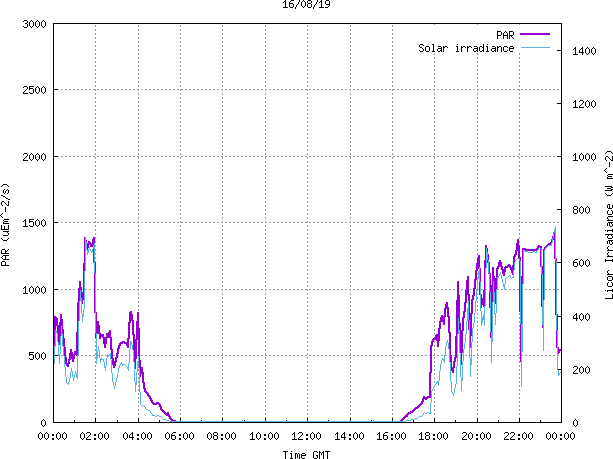 The PML meteorological station, situated on the south-west corner of the building roof, consists of a Hygroclip S3 temperature and humidity sensor housed in a radiation shield, a Mierij Meteo solid state wind sensor (MMW-005), a Chelsea instruments half-hemisphere PAR sensor, a Li-Cor pyranometer (LI-200SZ) and an Omni Instruments 6" tipping bucket raingauge (RG200). The data are logged every 5 minutes using a Pace Scientific XR5 data logger. The real-time rainfall data is likely in error - the correct values will be displayed after a time lag of approximately 24 hours. The meteorological station is sheltered from winds in the north-east and underestimates winds from this quarter. To use these data please contact Dr Tim Smyth.