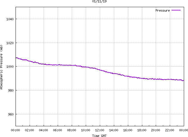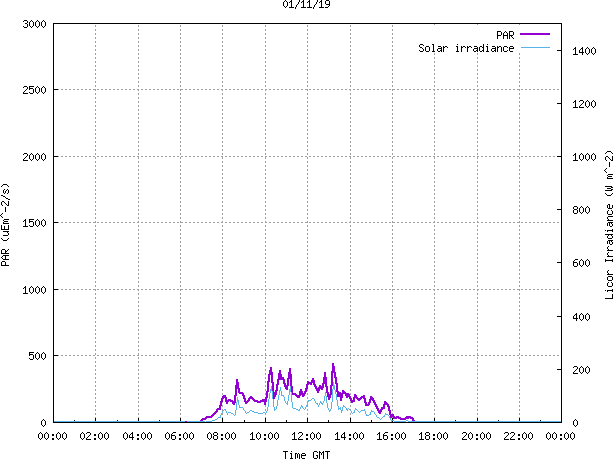 The PML meteorological station, situated on the south-west corner of the building roof, consists of a Hygroclip S3 temperature and humidity sensor housed in a radiation shield, a Mierij Meteo solid state wind sensor (MMW-005), a Chelsea instruments half-hemisphere PAR sensor, a Li-Cor pyranometer (LI-200SZ) and an Omni Instruments 6" tipping bucket raingauge (RG200). The data are logged every 5 minutes using a Pace Scientific XR5 data logger. The real-time rainfall data is likely in error - the correct values will be displayed after a time lag of approximately 24 hours. The meteorological station is sheltered from winds in the north-east and underestimates winds from this quarter. To use these data please contact Dr Tim Smyth.