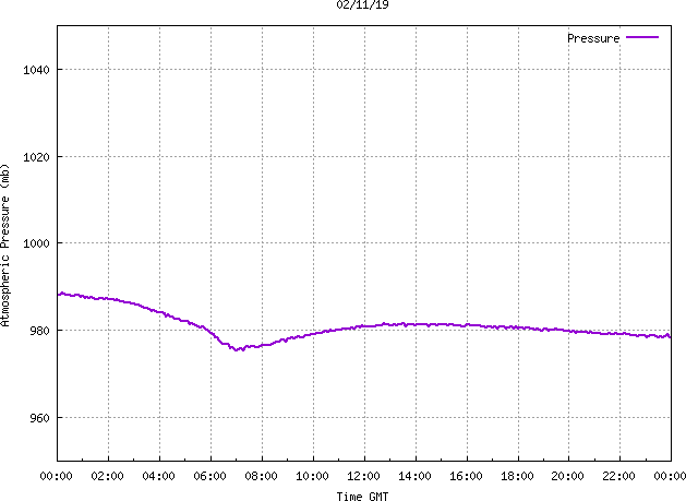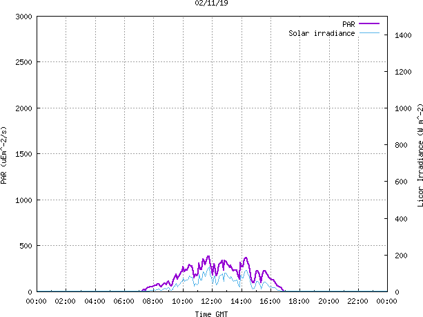 The PML meteorological station, situated on the south-west corner of the building roof, consists of a Hygroclip S3 temperature and humidity sensor housed in a radiation shield, a Mierij Meteo solid state wind sensor (MMW-005), a Chelsea instruments half-hemisphere PAR sensor, a Li-Cor pyranometer (LI-200SZ) and an Omni Instruments 6" tipping bucket raingauge (RG200). The data are logged every 5 minutes using a Pace Scientific XR5 data logger. The real-time rainfall data is likely in error - the correct values will be displayed after a time lag of approximately 24 hours. The meteorological station is sheltered from winds in the north-east and underestimates winds from this quarter. To use these data please contact Dr Tim Smyth.