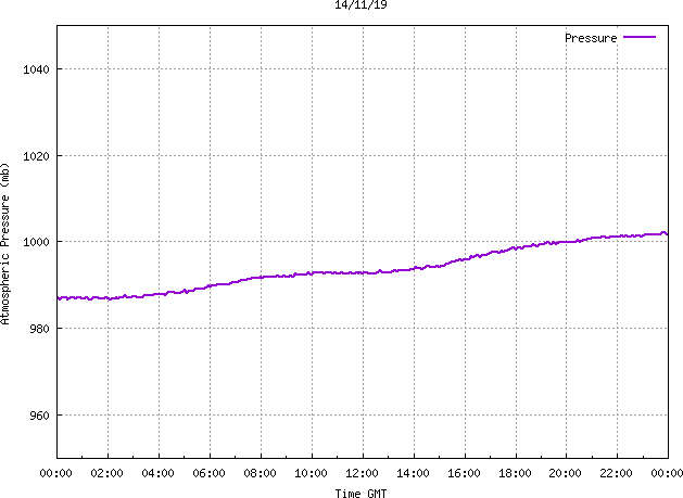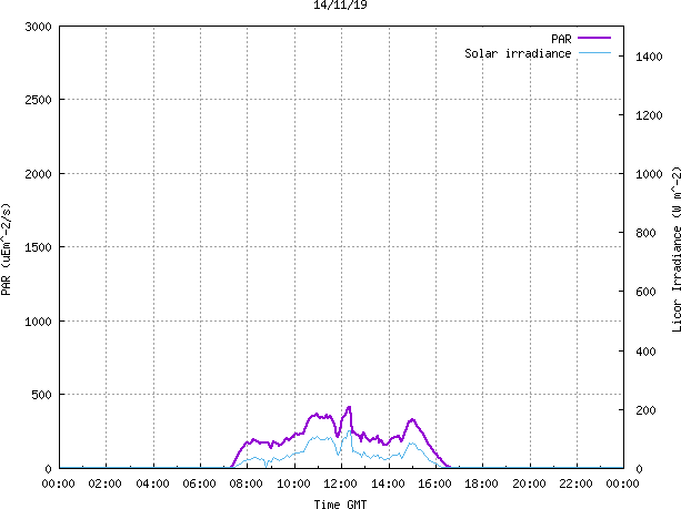 The PML meteorological station, situated on the south-west corner of the building roof, consists of a Hygroclip S3 temperature and humidity sensor housed in a radiation shield, a Mierij Meteo solid state wind sensor (MMW-005), a Chelsea instruments half-hemisphere PAR sensor, a Li-Cor pyranometer (LI-200SZ) and an Omni Instruments 6" tipping bucket raingauge (RG200). The data are logged every 5 minutes using a Pace Scientific XR5 data logger. The real-time rainfall data is likely in error - the correct values will be displayed after a time lag of approximately 24 hours. The meteorological station is sheltered from winds in the north-east and underestimates winds from this quarter. To use these data please contact Dr Tim Smyth.