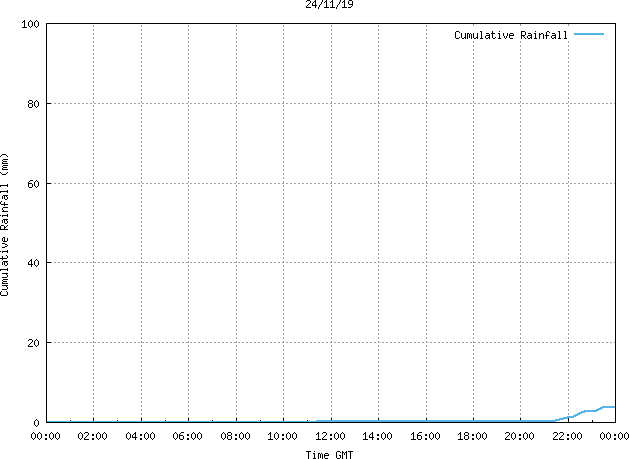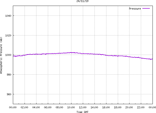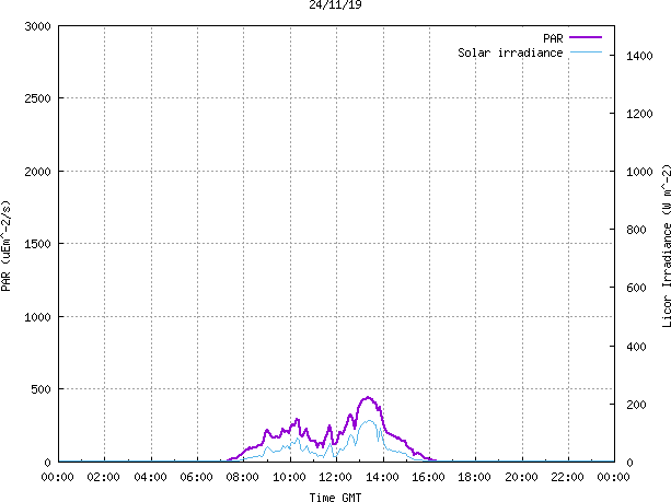 The PML meteorological station, situated on the south-west corner of the building roof, consists of a Hygroclip S3 temperature and humidity sensor housed in a radiation shield, a Mierij Meteo solid state wind sensor (MMW-005), a Chelsea instruments half-hemisphere PAR sensor, a Li-Cor pyranometer (LI-200SZ) and an Omni Instruments 6" tipping bucket raingauge (RG200). The data are logged every 5 minutes using a Pace Scientific XR5 data logger. The real-time rainfall data is likely in error - the correct values will be displayed after a time lag of approximately 24 hours. The meteorological station is sheltered from winds in the north-east and underestimates winds from this quarter. To use these data please contact Dr Tim Smyth.