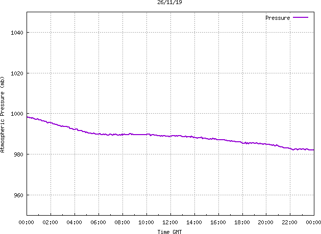 The PML meteorological station, situated on the south-west corner of the building roof, consists of a Hygroclip S3 temperature and humidity sensor housed in a radiation shield, a Mierij Meteo solid state wind sensor (MMW-005), a Chelsea instruments half-hemisphere PAR sensor, a Li-Cor pyranometer (LI-200SZ) and an Omni Instruments 6" tipping bucket raingauge (RG200). The data are logged every 5 minutes using a Pace Scientific XR5 data logger. The real-time rainfall data is likely in error - the correct values will be displayed after a time lag of approximately 24 hours. The meteorological station is sheltered from winds in the north-east and underestimates winds from this quarter. To use these data please contact Dr Tim Smyth.