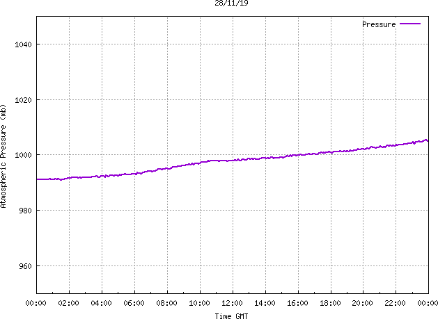 The PML meteorological station, situated on the south-west corner of the building roof, consists of a Hygroclip S3 temperature and humidity sensor housed in a radiation shield, a Mierij Meteo solid state wind sensor (MMW-005), a Chelsea instruments half-hemisphere PAR sensor, a Li-Cor pyranometer (LI-200SZ) and an Omni Instruments 6" tipping bucket raingauge (RG200). The data are logged every 5 minutes using a Pace Scientific XR5 data logger. The real-time rainfall data is likely in error - the correct values will be displayed after a time lag of approximately 24 hours. The meteorological station is sheltered from winds in the north-east and underestimates winds from this quarter. To use these data please contact Dr Tim Smyth.