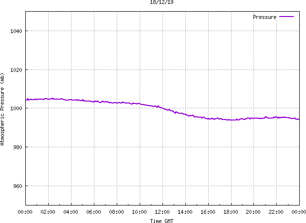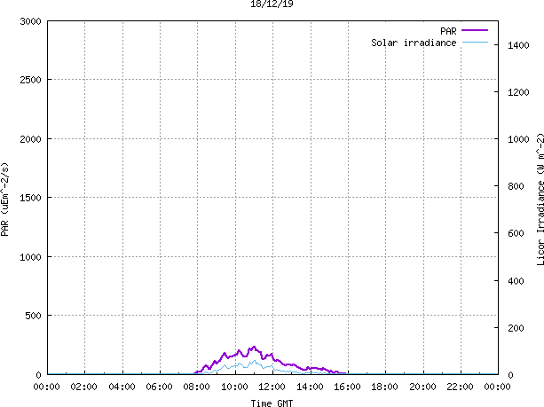The PML meteorological station, situated on the south-west corner of the building roof, consists of a Hygroclip S3 temperature and humidity sensor housed in a radiation shield, a Mierij Meteo solid state wind sensor (MMW-005), a Chelsea instruments half-hemisphere PAR sensor, a Li-Cor pyranometer (LI-200SZ) and an Omni Instruments 6" tipping bucket raingauge (RG200). The data are logged every 5 minutes using a Pace Scientific XR5 data logger. The real-time rainfall data is likely in error - the correct values will be displayed after a time lag of approximately 24 hours. The meteorological station is sheltered from winds in the north-east and underestimates winds from this quarter. To use these data please contact Dr Tim Smyth.