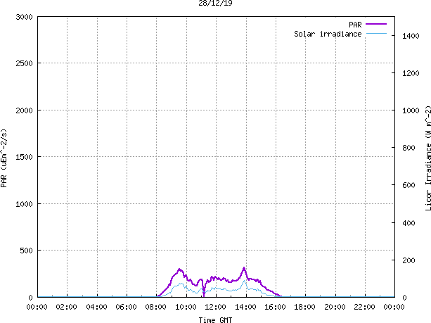 The PML meteorological station, situated on the south-west corner of the building roof, consists of a Hygroclip S3 temperature and humidity sensor housed in a radiation shield, a Mierij Meteo solid state wind sensor (MMW-005), a Chelsea instruments half-hemisphere PAR sensor, a Li-Cor pyranometer (LI-200SZ) and an Omni Instruments 6" tipping bucket raingauge (RG200). The data are logged every 5 minutes using a Pace Scientific XR5 data logger. The real-time rainfall data is likely in error - the correct values will be displayed after a time lag of approximately 24 hours. The meteorological station is sheltered from winds in the north-east and underestimates winds from this quarter. To use these data please contact Dr Tim Smyth.