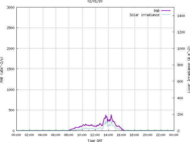 The PML meteorological station, situated on the south-west corner of the building roof, consists of a Hygroclip S3 temperature and humidity sensor housed in a radiation shield, a Mierij Meteo solid state wind sensor (MMW-005), a Chelsea instruments half-hemisphere PAR sensor, a Li-Cor pyranometer (LI-200SZ) and an Omni Instruments 6" tipping bucket raingauge (RG200). The data are logged every 5 minutes using a Pace Scientific XR5 data logger. The real-time rainfall data is likely in error - the correct values will be displayed after a time lag of approximately 24 hours. The meteorological station is sheltered from winds in the north-east and underestimates winds from this quarter. To use these data please contact Dr Tim Smyth.
