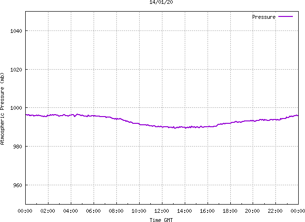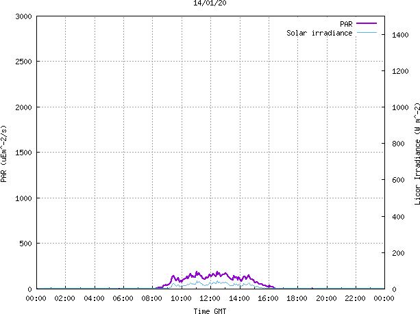The PML meteorological station, situated on the south-west corner of the building roof, consists of a Hygroclip S3 temperature and humidity sensor housed in a radiation shield, a Mierij Meteo solid state wind sensor (MMW-005), a Chelsea instruments half-hemisphere PAR sensor, a Li-Cor pyranometer (LI-200SZ) and an Omni Instruments 6" tipping bucket raingauge (RG200). The data are logged every 5 minutes using a Pace Scientific XR5 data logger. The real-time rainfall data is likely in error - the correct values will be displayed after a time lag of approximately 24 hours. The meteorological station is sheltered from winds in the north-east and underestimates winds from this quarter. To use these data please contact Dr Tim Smyth.