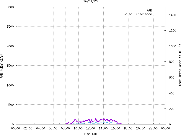 The PML meteorological station, situated on the south-west corner of the building roof, consists of a Hygroclip S3 temperature and humidity sensor housed in a radiation shield, a Mierij Meteo solid state wind sensor (MMW-005), a Chelsea instruments half-hemisphere PAR sensor, a Li-Cor pyranometer (LI-200SZ) and an Omni Instruments 6" tipping bucket raingauge (RG200). The data are logged every 5 minutes using a Pace Scientific XR5 data logger. The real-time rainfall data is likely in error - the correct values will be displayed after a time lag of approximately 24 hours. The meteorological station is sheltered from winds in the north-east and underestimates winds from this quarter. To use these data please contact Dr Tim Smyth.
