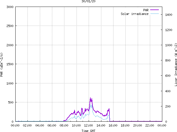 The PML meteorological station, situated on the south-west corner of the building roof, consists of a Hygroclip S3 temperature and humidity sensor housed in a radiation shield, a Mierij Meteo solid state wind sensor (MMW-005), a Chelsea instruments half-hemisphere PAR sensor, a Li-Cor pyranometer (LI-200SZ) and an Omni Instruments 6" tipping bucket raingauge (RG200). The data are logged every 5 minutes using a Pace Scientific XR5 data logger. The real-time rainfall data is likely in error - the correct values will be displayed after a time lag of approximately 24 hours. The meteorological station is sheltered from winds in the north-east and underestimates winds from this quarter. To use these data please contact Dr Tim Smyth.