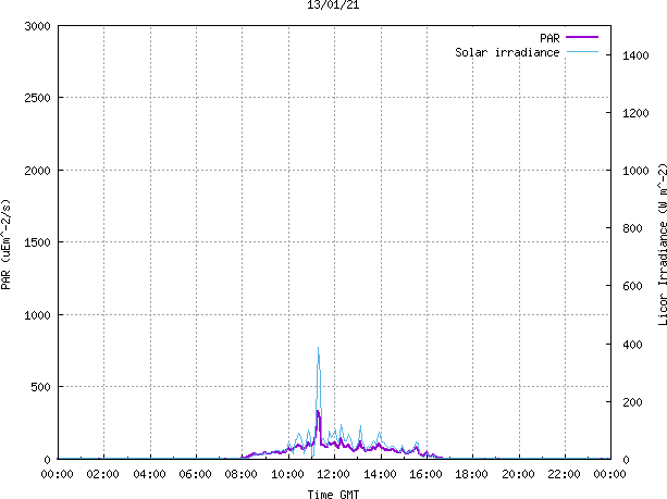 The PML meteorological station, situated on the south-west corner of the building roof, consists of a Hygroclip S3 temperature and humidity sensor housed in a radiation shield, a Mierij Meteo solid state wind sensor (MMW-005), a Chelsea instruments half-hemisphere PAR sensor, a Li-Cor pyranometer (LI-200SZ) and an Omni Instruments 6" tipping bucket raingauge (RG200). The data are logged every 5 minutes using a Pace Scientific XR5 data logger. The real-time rainfall data is likely in error - the correct values will be displayed after a time lag of approximately 24 hours. The meteorological station is sheltered from winds in the north-east and underestimates winds from this quarter. To use these data please contact Dr Tim Smyth.