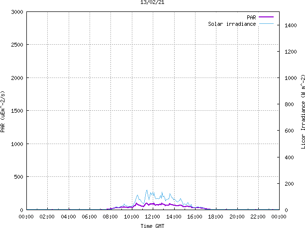 The PML meteorological station, situated on the south-west corner of the building roof, consists of a Hygroclip S3 temperature and humidity sensor housed in a radiation shield, a Mierij Meteo solid state wind sensor (MMW-005), a Chelsea instruments half-hemisphere PAR sensor, a Li-Cor pyranometer (LI-200SZ) and an Omni Instruments 6" tipping bucket raingauge (RG200). The data are logged every 5 minutes using a Pace Scientific XR5 data logger. The real-time rainfall data is likely in error - the correct values will be displayed after a time lag of approximately 24 hours. The meteorological station is sheltered from winds in the north-east and underestimates winds from this quarter. To use these data please contact Dr Tim Smyth.