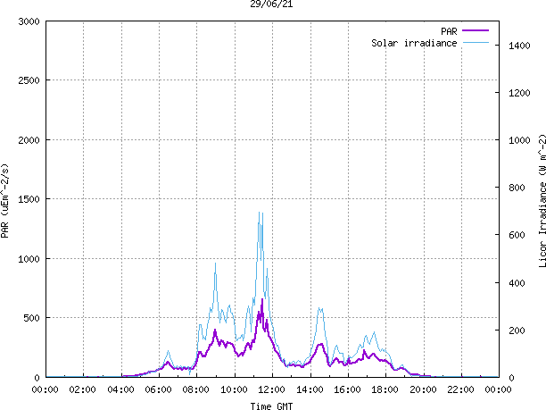 The PML meteorological station, situated on the south-west corner of the building roof, consists of a Hygroclip S3 temperature and humidity sensor housed in a radiation shield, a Mierij Meteo solid state wind sensor (MMW-005), a Chelsea instruments half-hemisphere PAR sensor, a Li-Cor pyranometer (LI-200SZ) and an Omni Instruments 6" tipping bucket raingauge (RG200). The data are logged every 5 minutes using a Pace Scientific XR5 data logger. The real-time rainfall data is likely in error - the correct values will be displayed after a time lag of approximately 24 hours. The meteorological station is sheltered from winds in the north-east and underestimates winds from this quarter. To use these data please contact Dr Tim Smyth.
