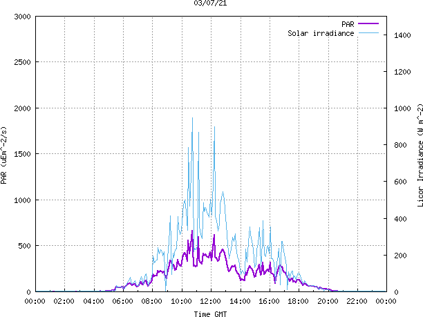 The PML meteorological station, situated on the south-west corner of the building roof, consists of a Hygroclip S3 temperature and humidity sensor housed in a radiation shield, a Mierij Meteo solid state wind sensor (MMW-005), a Chelsea instruments half-hemisphere PAR sensor, a Li-Cor pyranometer (LI-200SZ) and an Omni Instruments 6" tipping bucket raingauge (RG200). The data are logged every 5 minutes using a Pace Scientific XR5 data logger. The real-time rainfall data is likely in error - the correct values will be displayed after a time lag of approximately 24 hours. The meteorological station is sheltered from winds in the north-east and underestimates winds from this quarter. To use these data please contact Dr Tim Smyth.