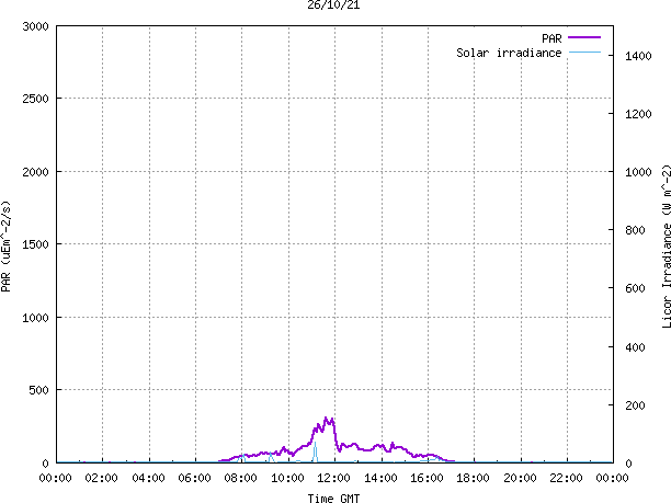 The PML meteorological station, situated on the south-west corner of the building roof, consists of a Hygroclip S3 temperature and humidity sensor housed in a radiation shield, a Mierij Meteo solid state wind sensor (MMW-005), a Chelsea instruments half-hemisphere PAR sensor, a Li-Cor pyranometer (LI-200SZ) and an Omni Instruments 6" tipping bucket raingauge (RG200). The data are logged every 5 minutes using a Pace Scientific XR5 data logger. The real-time rainfall data is likely in error - the correct values will be displayed after a time lag of approximately 24 hours. The meteorological station is sheltered from winds in the north-east and underestimates winds from this quarter. To use these data please contact Dr Tim Smyth.
