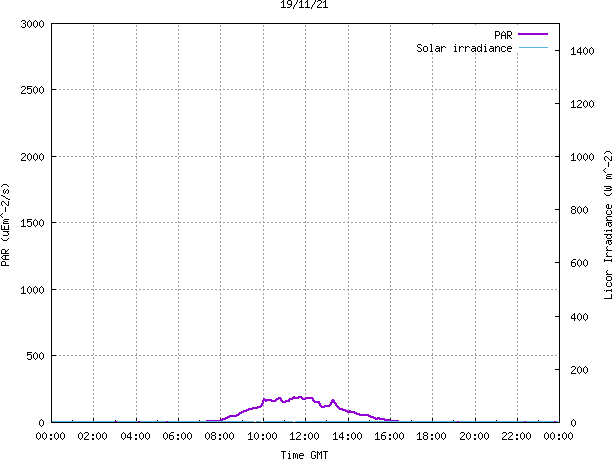 The PML meteorological station, situated on the south-west corner of the building roof, consists of a Hygroclip S3 temperature and humidity sensor housed in a radiation shield, a Mierij Meteo solid state wind sensor (MMW-005), a Chelsea instruments half-hemisphere PAR sensor, a Li-Cor pyranometer (LI-200SZ) and an Omni Instruments 6" tipping bucket raingauge (RG200). The data are logged every 5 minutes using a Pace Scientific XR5 data logger. The real-time rainfall data is likely in error - the correct values will be displayed after a time lag of approximately 24 hours. The meteorological station is sheltered from winds in the north-east and underestimates winds from this quarter. To use these data please contact Dr Tim Smyth.