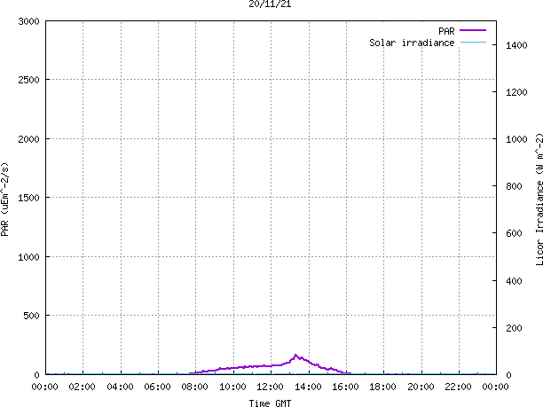 The PML meteorological station, situated on the south-west corner of the building roof, consists of a Hygroclip S3 temperature and humidity sensor housed in a radiation shield, a Mierij Meteo solid state wind sensor (MMW-005), a Chelsea instruments half-hemisphere PAR sensor, a Li-Cor pyranometer (LI-200SZ) and an Omni Instruments 6" tipping bucket raingauge (RG200). The data are logged every 5 minutes using a Pace Scientific XR5 data logger. The real-time rainfall data is likely in error - the correct values will be displayed after a time lag of approximately 24 hours. The meteorological station is sheltered from winds in the north-east and underestimates winds from this quarter. To use these data please contact Dr Tim Smyth.