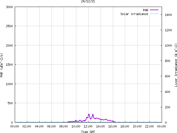 The PML meteorological station, situated on the south-west corner of the building roof, consists of a Hygroclip S3 temperature and humidity sensor housed in a radiation shield, a Mierij Meteo solid state wind sensor (MMW-005), a Chelsea instruments half-hemisphere PAR sensor, a Li-Cor pyranometer (LI-200SZ) and an Omni Instruments 6" tipping bucket raingauge (RG200). The data are logged every 5 minutes using a Pace Scientific XR5 data logger. The real-time rainfall data is likely in error - the correct values will be displayed after a time lag of approximately 24 hours. The meteorological station is sheltered from winds in the north-east and underestimates winds from this quarter. To use these data please contact Dr Tim Smyth.