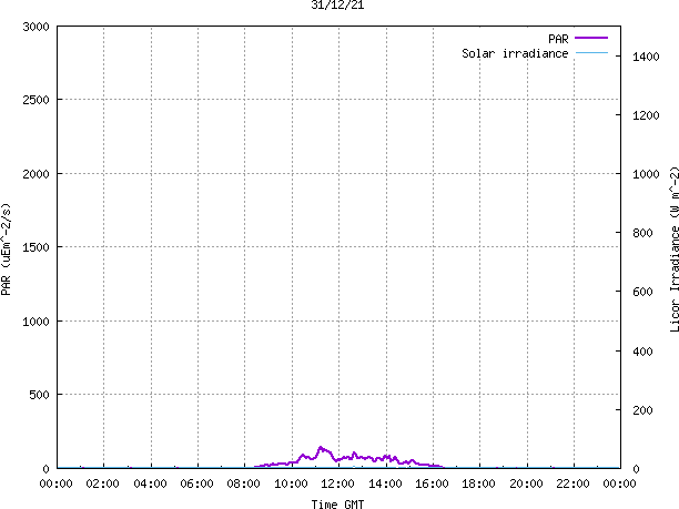 The PML meteorological station, situated on the south-west corner of the building roof, consists of a Hygroclip S3 temperature and humidity sensor housed in a radiation shield, a Mierij Meteo solid state wind sensor (MMW-005), a Chelsea instruments half-hemisphere PAR sensor, a Li-Cor pyranometer (LI-200SZ) and an Omni Instruments 6" tipping bucket raingauge (RG200). The data are logged every 5 minutes using a Pace Scientific XR5 data logger. The real-time rainfall data is likely in error - the correct values will be displayed after a time lag of approximately 24 hours. The meteorological station is sheltered from winds in the north-east and underestimates winds from this quarter. To use these data please contact Dr Tim Smyth.