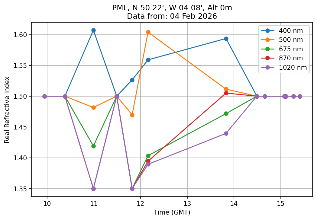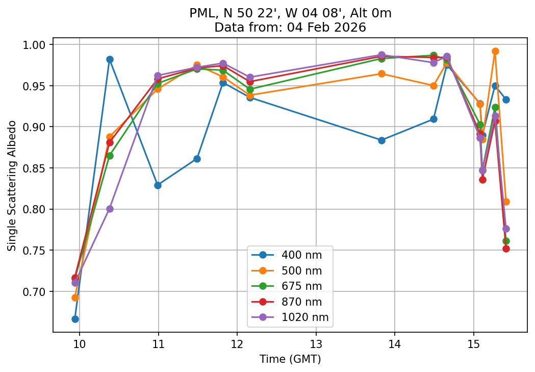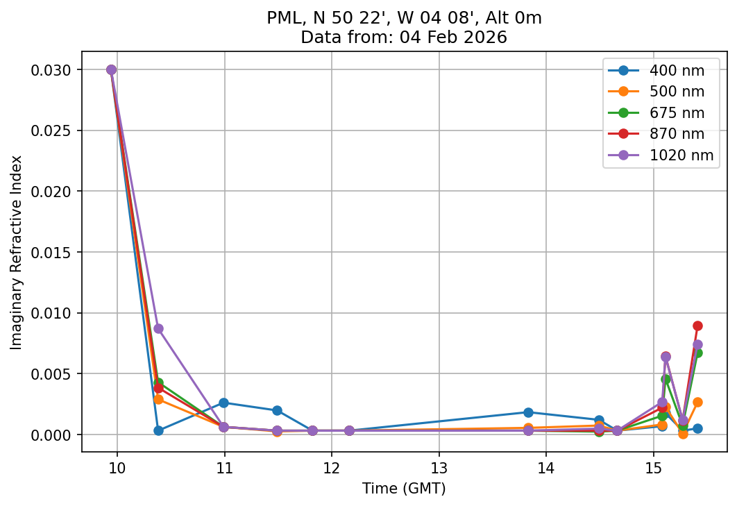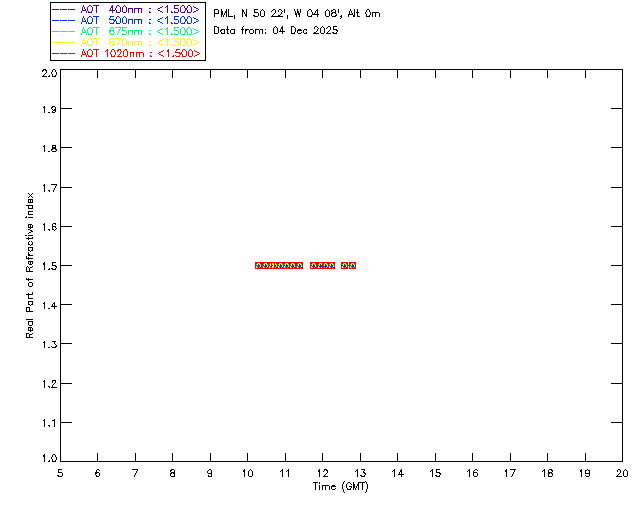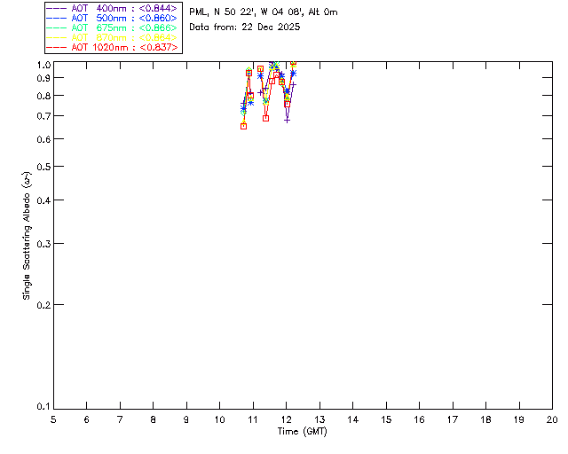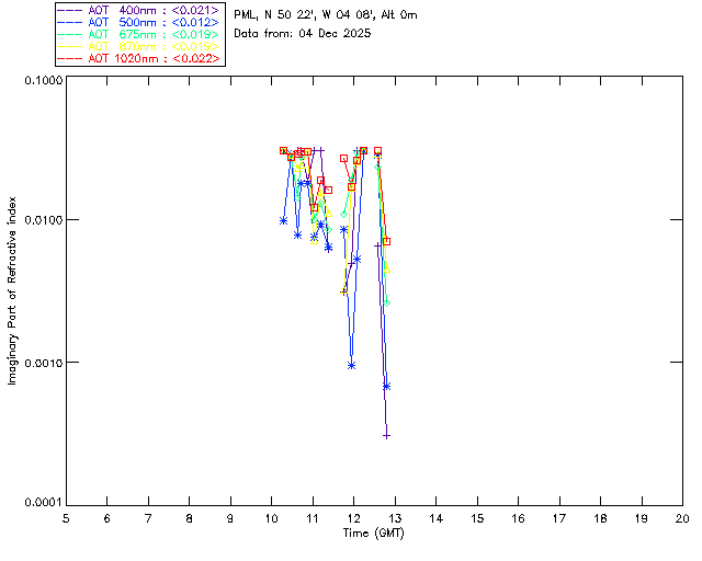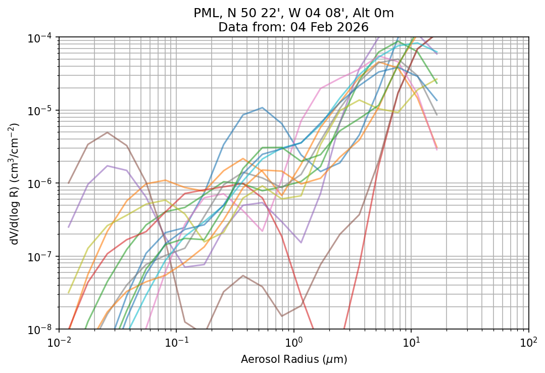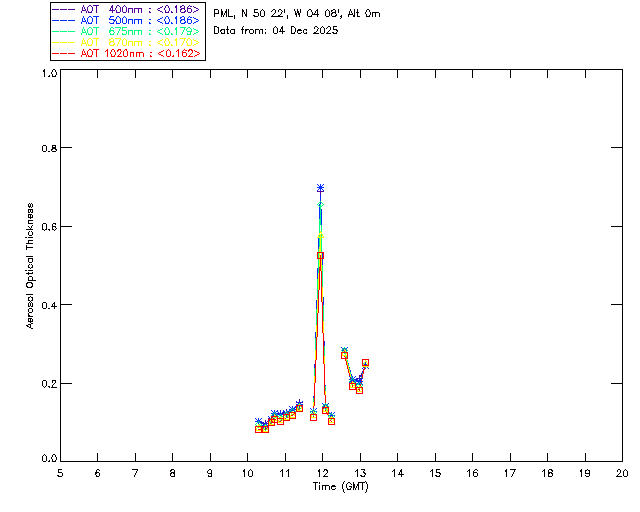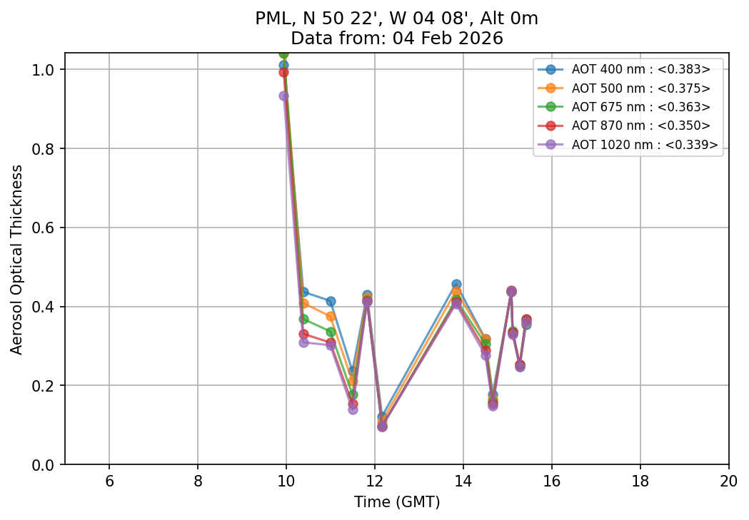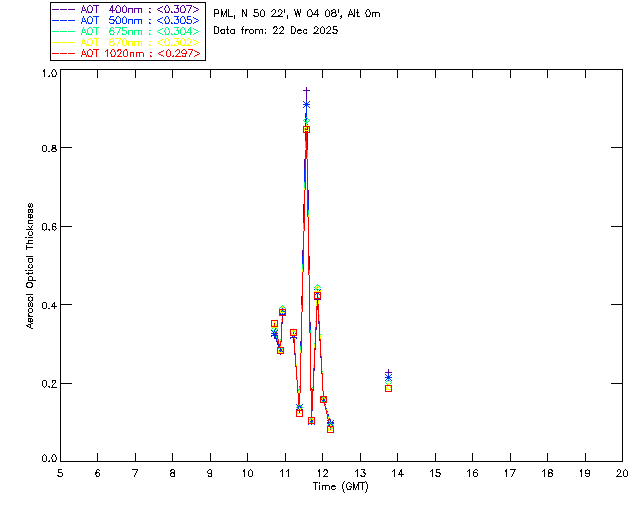 In May 2001 a PREDE POM01-L was installed on the roof of the Plymouth Marine Laboratory to continue the atmospheric correction research of the PML Remote Sensing Group. This was to replace the AERONET CIMEL sunphotometer situated at Rame Head which was decommissioned in 1999. The instrument operates at 7 wavelengths (315, 400, 500, 670, 870, 940 and 1020nm) and scans at pre-set angles away from the solar disk to determine, using the inversion code of Nakajima et al. (2006), various properties of tiny particles called aerosols within the atmospheric column. From these measurements useful atmospheric aerosol parameters such as the Aerosol Optical Thickness (AOT), aerosol size distribution and single scattering albedo can be calculated. Marine aerosols tend to be bigger (D > 1µm) than those generated over the land (0.01 < D < 1µm) and are of a different chemical composition; marine aerosols are salt particles whereas terrestrial aerosols are sulphate compounds.