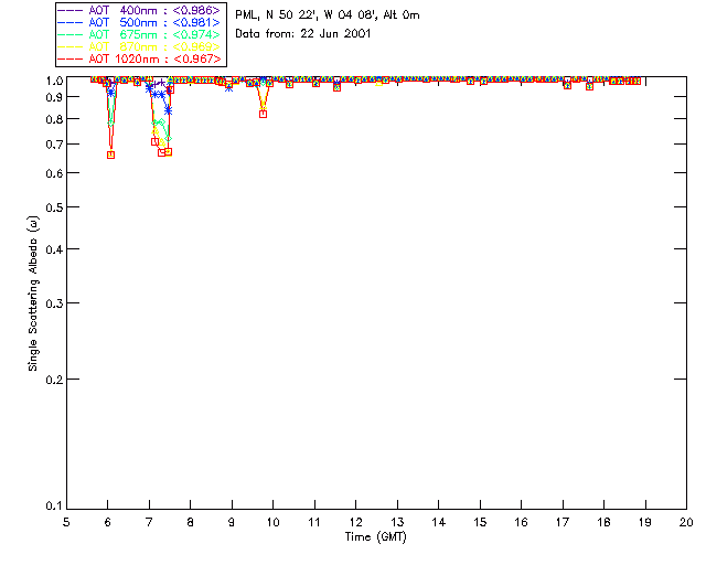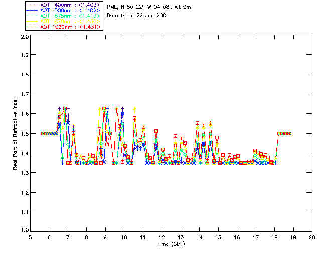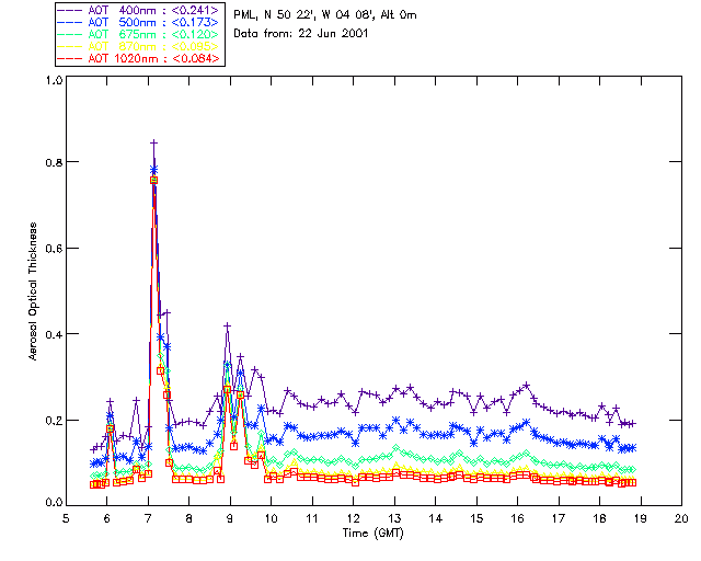 In May 2001 a PREDE POM01-L was installed on the roof of the Plymouth Marine Laboratory to continue the atmospheric correction research of the PML Remote Sensing Group. This was to replace the AERONET CIMEL sunphotometer situated at Rame Head which was decommissioned in 1999. The instrument operates at 7 wavelengths (315, 400, 500, 670, 870, 940 and 1020nm) and scans at pre-set angles away from the solar disk to determine, using the inversion code of Nakajima et al. (2006), various properties of tiny particles called aerosols within the atmospheric column. From these measurements useful atmospheric aerosol parameters such as the Aerosol Optical Thickness (AOT), aerosol size distribution and single scattering albedo can be calculated. Marine aerosols tend to be bigger (D > 1µm) than those generated over the land (0.01 < D < 1µm) and are of a different chemical composition; marine aerosols are salt particles whereas terrestrial aerosols are sulphate compounds.