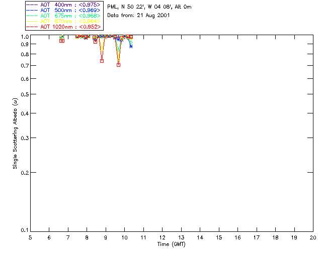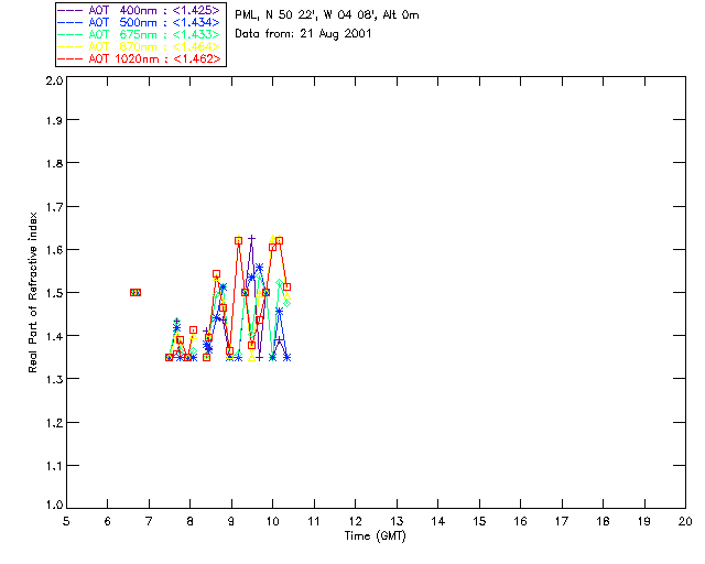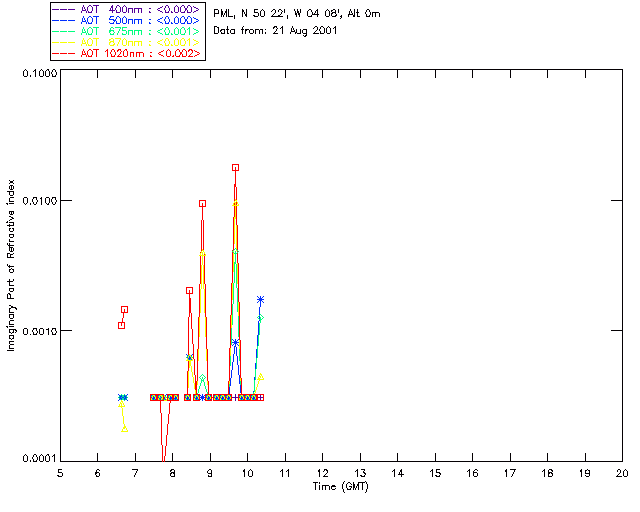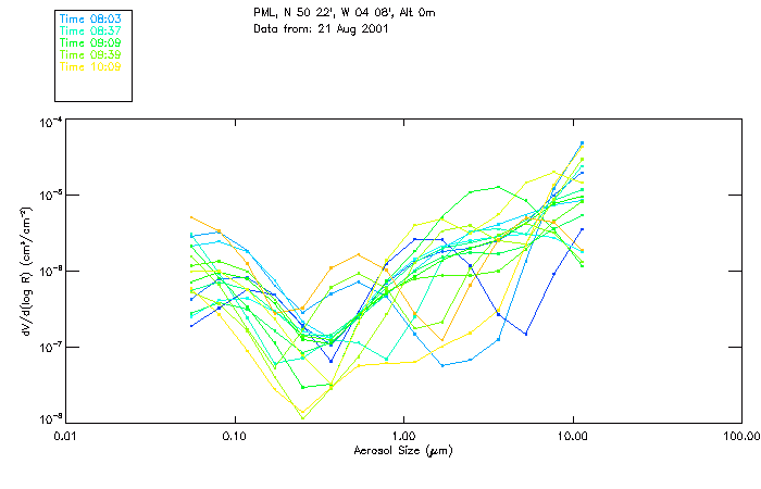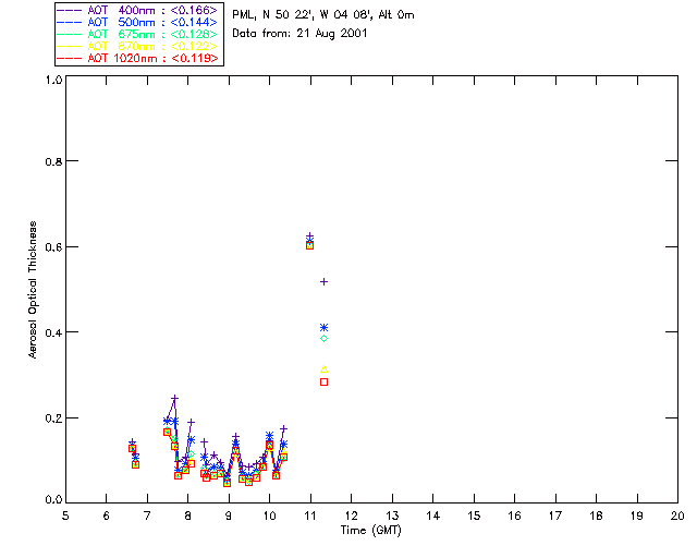 In May 2001 a PREDE POM01-L was installed on the roof of the Plymouth Marine Laboratory to continue the atmospheric correction research of the PML Remote Sensing Group. This was to replace the AERONET CIMEL sunphotometer situated at Rame Head which was decommissioned in 1999. The instrument operates at 7 wavelengths (315, 400, 500, 670, 870, 940 and 1020nm) and scans at pre-set angles away from the solar disk to determine, using the inversion code of Nakajima et al. (2006), various properties of tiny particles called aerosols within the atmospheric column. From these measurements useful atmospheric aerosol parameters such as the Aerosol Optical Thickness (AOT), aerosol size distribution and single scattering albedo can be calculated. Marine aerosols tend to be bigger (D > 1µm) than those generated over the land (0.01 < D < 1µm) and are of a different chemical composition; marine aerosols are salt particles whereas terrestrial aerosols are sulphate compounds.