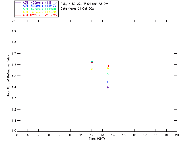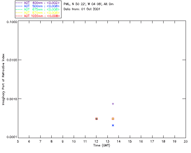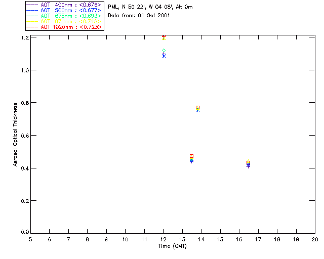 In May 2001 a PREDE POM01-L was installed on the roof of the Plymouth Marine Laboratory to continue the atmospheric correction research of the PML Remote Sensing Group. This was to replace the AERONET CIMEL sunphotometer situated at Rame Head which was decommissioned in 1999. The instrument operates at 7 wavelengths (315, 400, 500, 670, 870, 940 and 1020nm) and scans at pre-set angles away from the solar disk to determine, using the inversion code of Nakajima et al. (2006), various properties of tiny particles called aerosols within the atmospheric column. From these measurements useful atmospheric aerosol parameters such as the Aerosol Optical Thickness (AOT), aerosol size distribution and single scattering albedo can be calculated. Marine aerosols tend to be bigger (D > 1µm) than those generated over the land (0.01 < D < 1µm) and are of a different chemical composition; marine aerosols are salt particles whereas terrestrial aerosols are sulphate compounds.