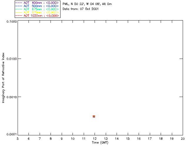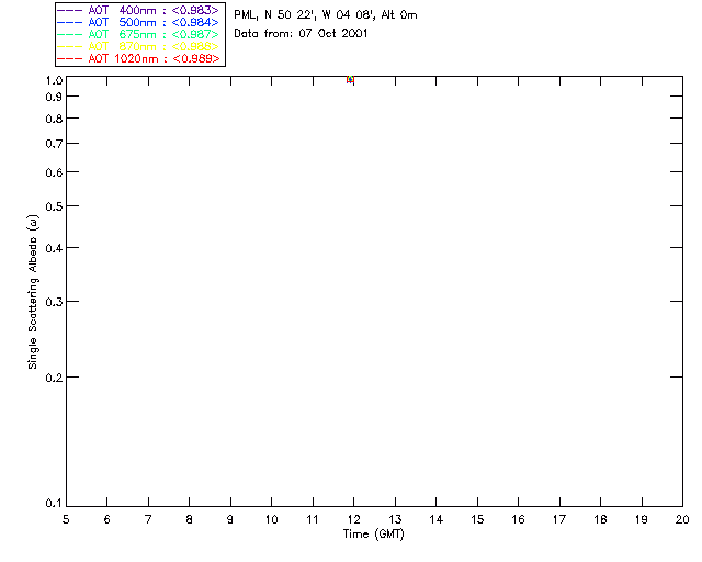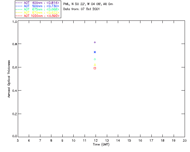 In May 2001 a PREDE POM01-L was installed on the roof of the Plymouth Marine Laboratory to continue the atmospheric correction research of the PML Remote Sensing Group. This was to replace the AERONET CIMEL sunphotometer situated at Rame Head which was decommissioned in 1999. The instrument operates at 7 wavelengths (315, 400, 500, 670, 870, 940 and 1020nm) and scans at pre-set angles away from the solar disk to determine, using the inversion code of Nakajima et al. (2006), various properties of tiny particles called aerosols within the atmospheric column. From these measurements useful atmospheric aerosol parameters such as the Aerosol Optical Thickness (AOT), aerosol size distribution and single scattering albedo can be calculated. Marine aerosols tend to be bigger (D > 1µm) than those generated over the land (0.01 < D < 1µm) and are of a different chemical composition; marine aerosols are salt particles whereas terrestrial aerosols are sulphate compounds.