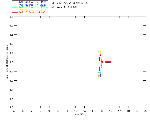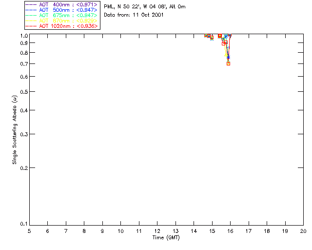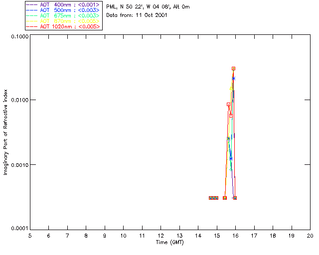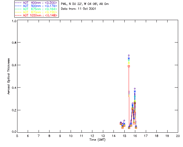In May 2001 a PREDE POM01-L was installed on the roof of the Plymouth Marine Laboratory to continue the atmospheric correction research of the PML Remote Sensing Group. This was to replace the AERONET CIMEL sunphotometer situated at Rame Head which was decommissioned in 1999. The instrument operates at 7 wavelengths (315, 400, 500, 670, 870, 940 and 1020nm) and scans at pre-set angles away from the solar disk to determine, using the inversion code of Nakajima et al. (2006), various properties of tiny particles called aerosols within the atmospheric column. From these measurements useful atmospheric aerosol parameters such as the Aerosol Optical Thickness (AOT), aerosol size distribution and single scattering albedo can be calculated. Marine aerosols tend to be bigger (D > 1µm) than those generated over the land (0.01 < D < 1µm) and are of a different chemical composition; marine aerosols are salt particles whereas terrestrial aerosols are sulphate compounds.