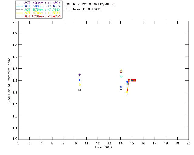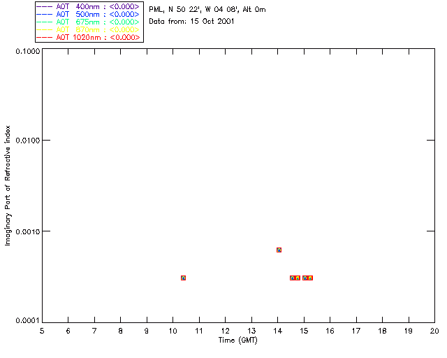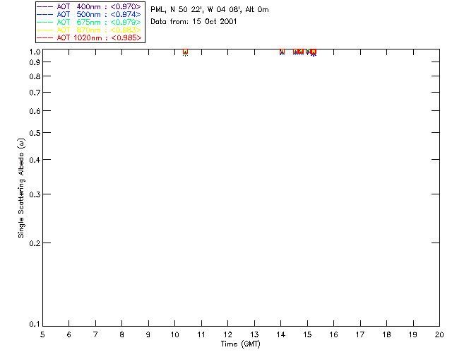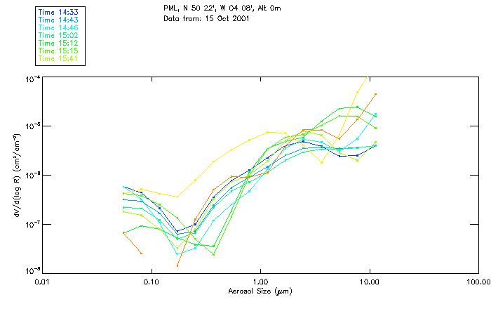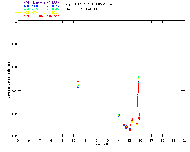 In May 2001 a PREDE POM01-L was installed on the roof of the Plymouth Marine Laboratory to continue the atmospheric correction research of the PML Remote Sensing Group. This was to replace the AERONET CIMEL sunphotometer situated at Rame Head which was decommissioned in 1999. The instrument operates at 7 wavelengths (315, 400, 500, 670, 870, 940 and 1020nm) and scans at pre-set angles away from the solar disk to determine, using the inversion code of Nakajima et al. (2006), various properties of tiny particles called aerosols within the atmospheric column. From these measurements useful atmospheric aerosol parameters such as the Aerosol Optical Thickness (AOT), aerosol size distribution and single scattering albedo can be calculated. Marine aerosols tend to be bigger (D > 1µm) than those generated over the land (0.01 < D < 1µm) and are of a different chemical composition; marine aerosols are salt particles whereas terrestrial aerosols are sulphate compounds.