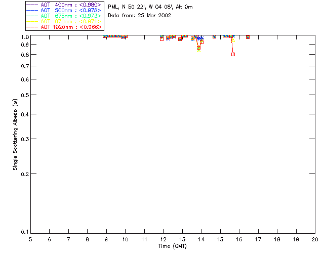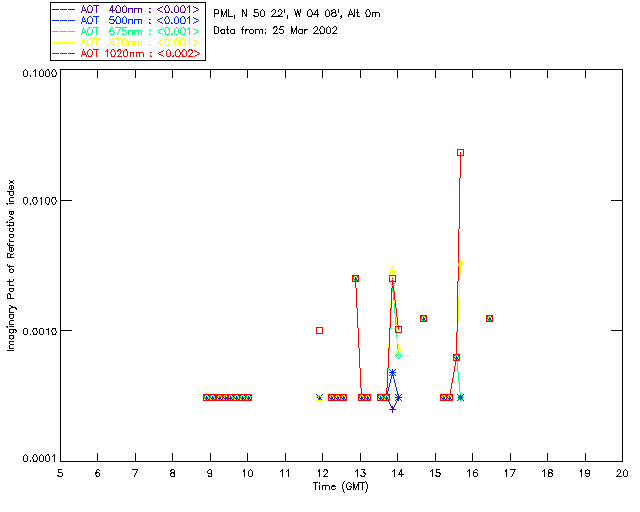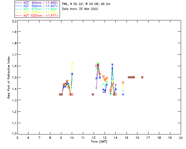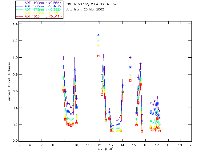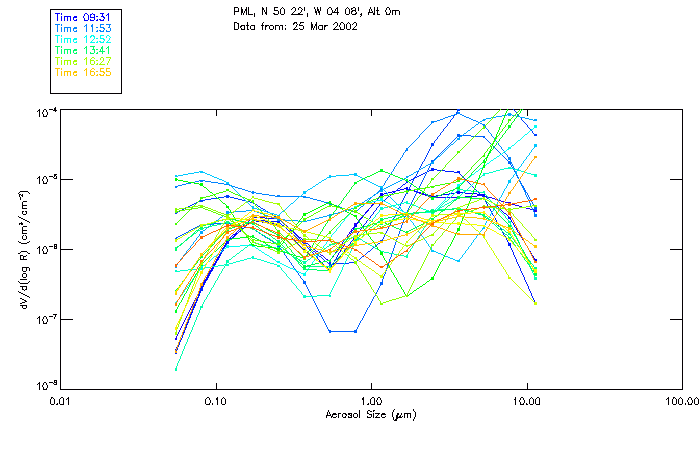 In May 2001 a PREDE POM01-L was installed on the roof of the Plymouth Marine Laboratory to continue the atmospheric correction research of the PML Remote Sensing Group. This was to replace the AERONET CIMEL sunphotometer situated at Rame Head which was decommissioned in 1999. The instrument operates at 7 wavelengths (315, 400, 500, 670, 870, 940 and 1020nm) and scans at pre-set angles away from the solar disk to determine, using the inversion code of Nakajima et al. (2006), various properties of tiny particles called aerosols within the atmospheric column. From these measurements useful atmospheric aerosol parameters such as the Aerosol Optical Thickness (AOT), aerosol size distribution and single scattering albedo can be calculated. Marine aerosols tend to be bigger (D > 1µm) than those generated over the land (0.01 < D < 1µm) and are of a different chemical composition; marine aerosols are salt particles whereas terrestrial aerosols are sulphate compounds.