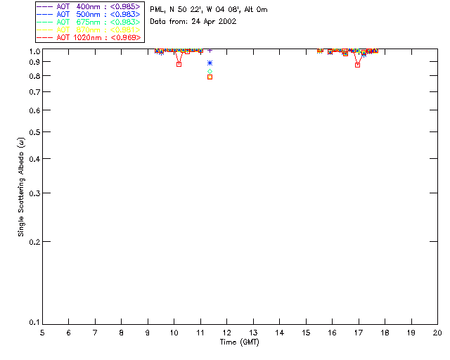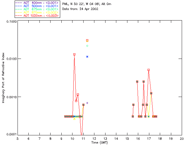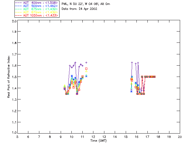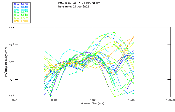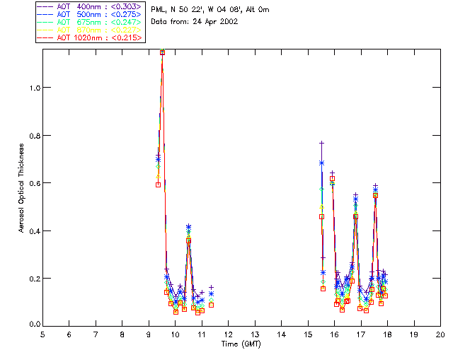 In May 2001 a PREDE POM01-L was installed on the roof of the Plymouth Marine Laboratory to continue the atmospheric correction research of the PML Remote Sensing Group. This was to replace the AERONET CIMEL sunphotometer situated at Rame Head which was decommissioned in 1999. The instrument operates at 7 wavelengths (315, 400, 500, 670, 870, 940 and 1020nm) and scans at pre-set angles away from the solar disk to determine, using the inversion code of Nakajima et al. (2006), various properties of tiny particles called aerosols within the atmospheric column. From these measurements useful atmospheric aerosol parameters such as the Aerosol Optical Thickness (AOT), aerosol size distribution and single scattering albedo can be calculated. Marine aerosols tend to be bigger (D > 1µm) than those generated over the land (0.01 < D < 1µm) and are of a different chemical composition; marine aerosols are salt particles whereas terrestrial aerosols are sulphate compounds.
