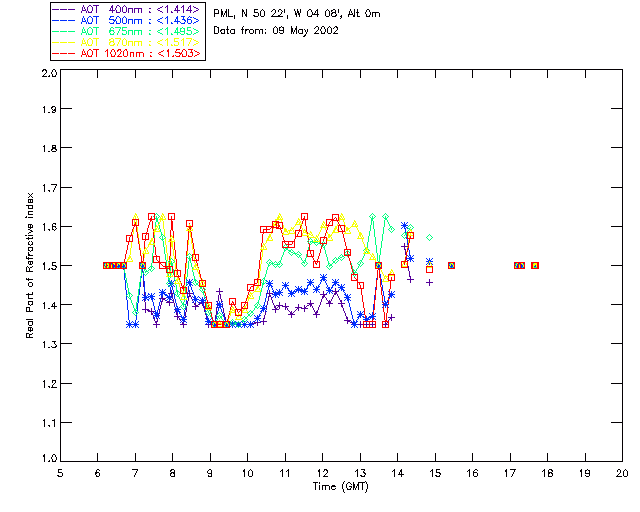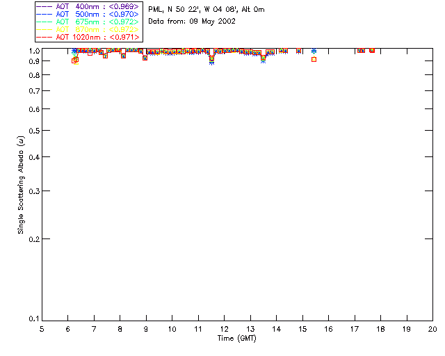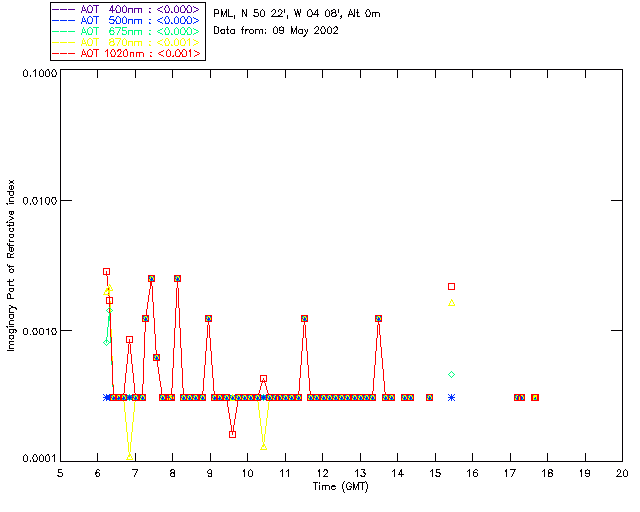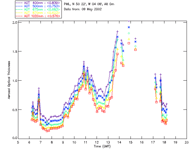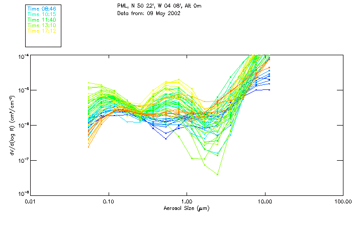 In May 2001 a PREDE POM01-L was installed on the roof of the Plymouth Marine Laboratory to continue the atmospheric correction research of the PML Remote Sensing Group. This was to replace the AERONET CIMEL sunphotometer situated at Rame Head which was decommissioned in 1999. The instrument operates at 7 wavelengths (315, 400, 500, 670, 870, 940 and 1020nm) and scans at pre-set angles away from the solar disk to determine, using the inversion code of Nakajima et al. (2006), various properties of tiny particles called aerosols within the atmospheric column. From these measurements useful atmospheric aerosol parameters such as the Aerosol Optical Thickness (AOT), aerosol size distribution and single scattering albedo can be calculated. Marine aerosols tend to be bigger (D > 1µm) than those generated over the land (0.01 < D < 1µm) and are of a different chemical composition; marine aerosols are salt particles whereas terrestrial aerosols are sulphate compounds.