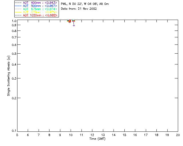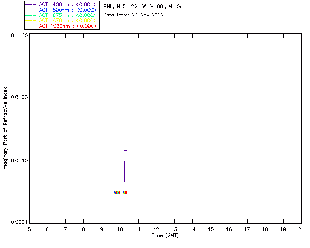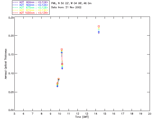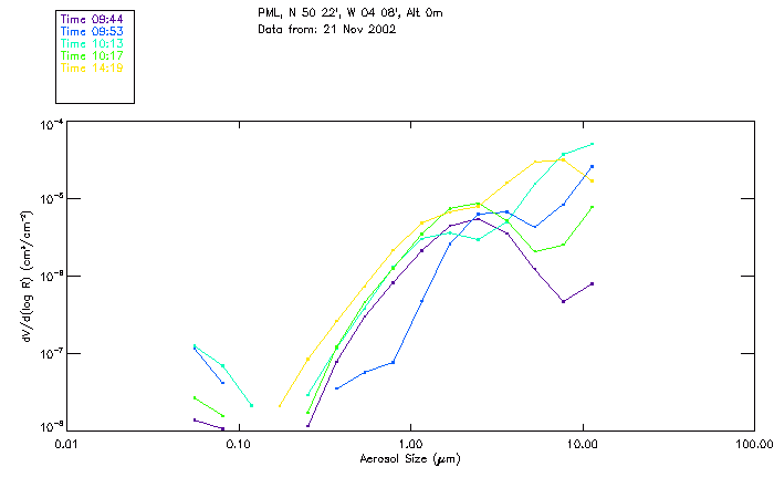 In May 2001 a PREDE POM01-L was installed on the roof of the Plymouth Marine Laboratory to continue the atmospheric correction research of the PML Remote Sensing Group. This was to replace the AERONET CIMEL sunphotometer situated at Rame Head which was decommissioned in 1999. The instrument operates at 7 wavelengths (315, 400, 500, 670, 870, 940 and 1020nm) and scans at pre-set angles away from the solar disk to determine, using the inversion code of Nakajima et al. (2006), various properties of tiny particles called aerosols within the atmospheric column. From these measurements useful atmospheric aerosol parameters such as the Aerosol Optical Thickness (AOT), aerosol size distribution and single scattering albedo can be calculated. Marine aerosols tend to be bigger (D > 1µm) than those generated over the land (0.01 < D < 1µm) and are of a different chemical composition; marine aerosols are salt particles whereas terrestrial aerosols are sulphate compounds.