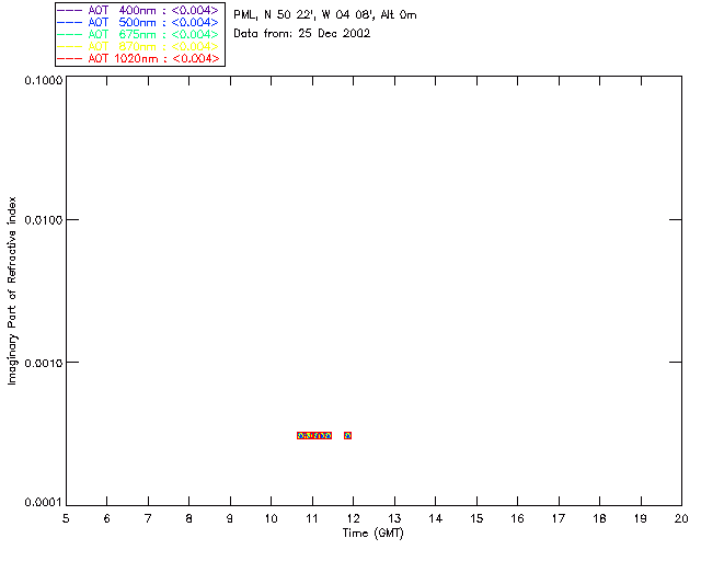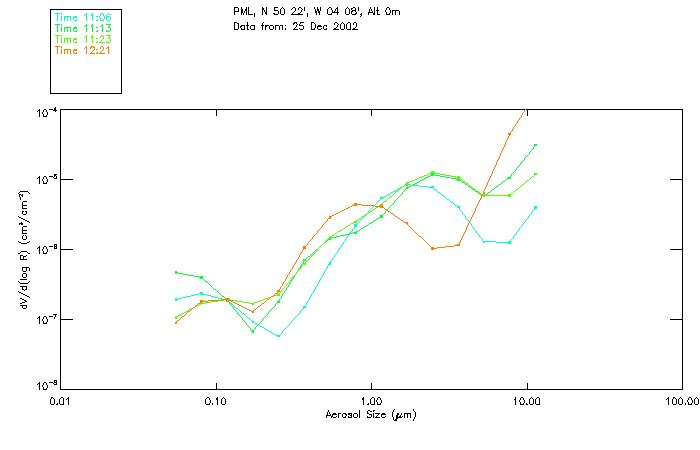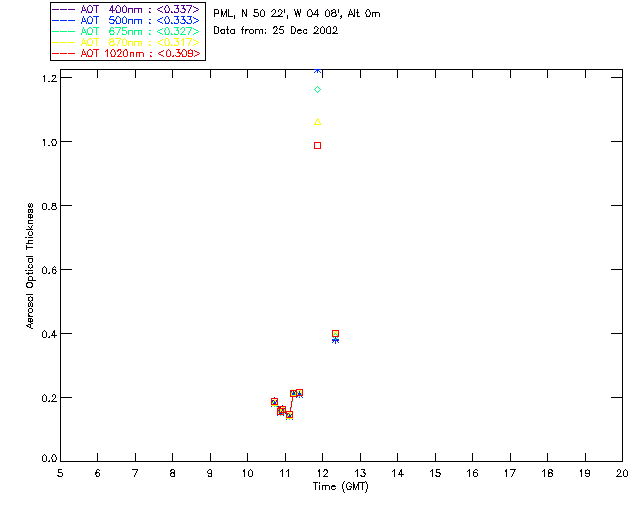 In May 2001 a PREDE POM01-L was installed on the roof of the Plymouth Marine Laboratory to continue the atmospheric correction research of the PML Remote Sensing Group. This was to replace the AERONET CIMEL sunphotometer situated at Rame Head which was decommissioned in 1999. The instrument operates at 7 wavelengths (315, 400, 500, 670, 870, 940 and 1020nm) and scans at pre-set angles away from the solar disk to determine, using the inversion code of Nakajima et al. (2006), various properties of tiny particles called aerosols within the atmospheric column. From these measurements useful atmospheric aerosol parameters such as the Aerosol Optical Thickness (AOT), aerosol size distribution and single scattering albedo can be calculated. Marine aerosols tend to be bigger (D > 1µm) than those generated over the land (0.01 < D < 1µm) and are of a different chemical composition; marine aerosols are salt particles whereas terrestrial aerosols are sulphate compounds.