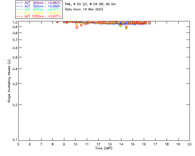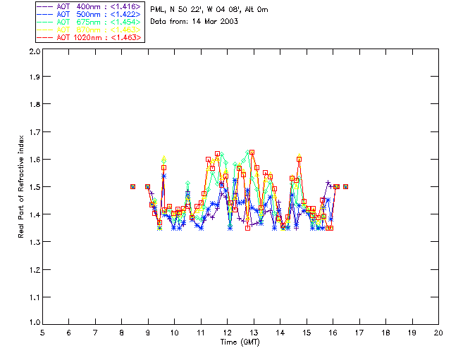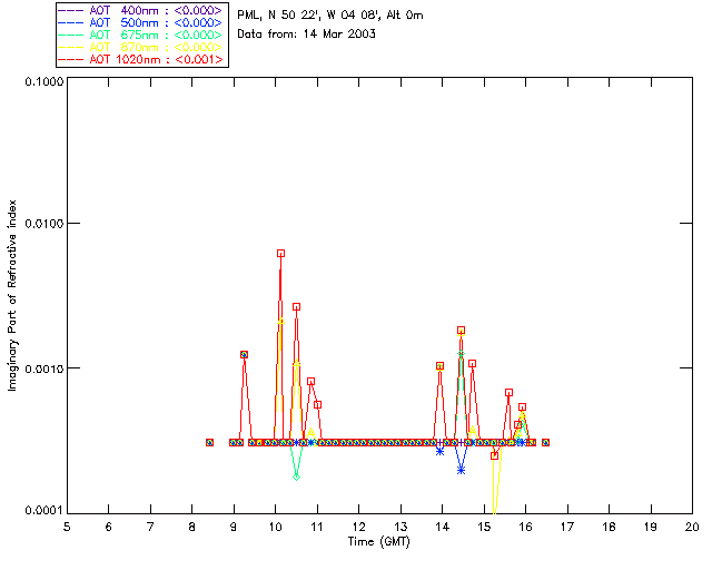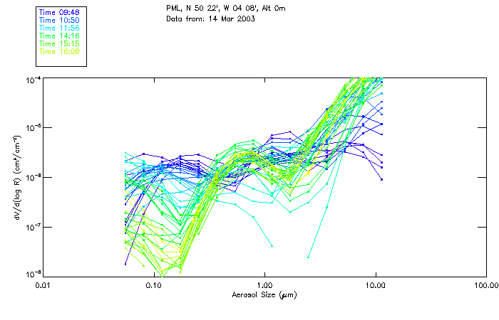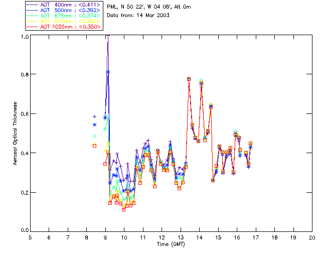 In May 2001 a PREDE POM01-L was installed on the roof of the Plymouth Marine Laboratory to continue the atmospheric correction research of the PML Remote Sensing Group. This was to replace the AERONET CIMEL sunphotometer situated at Rame Head which was decommissioned in 1999. The instrument operates at 7 wavelengths (315, 400, 500, 670, 870, 940 and 1020nm) and scans at pre-set angles away from the solar disk to determine, using the inversion code of Nakajima et al. (2006), various properties of tiny particles called aerosols within the atmospheric column. From these measurements useful atmospheric aerosol parameters such as the Aerosol Optical Thickness (AOT), aerosol size distribution and single scattering albedo can be calculated. Marine aerosols tend to be bigger (D > 1µm) than those generated over the land (0.01 < D < 1µm) and are of a different chemical composition; marine aerosols are salt particles whereas terrestrial aerosols are sulphate compounds.
