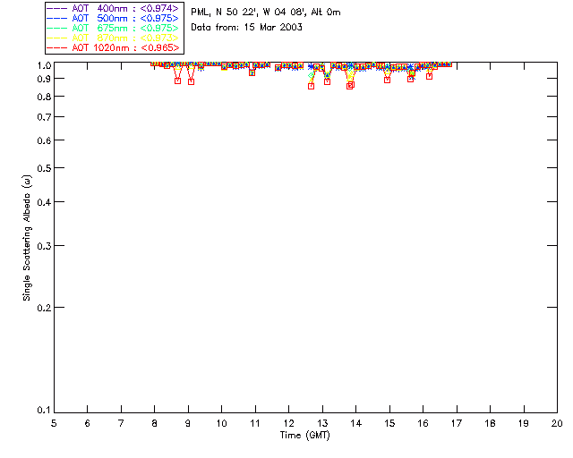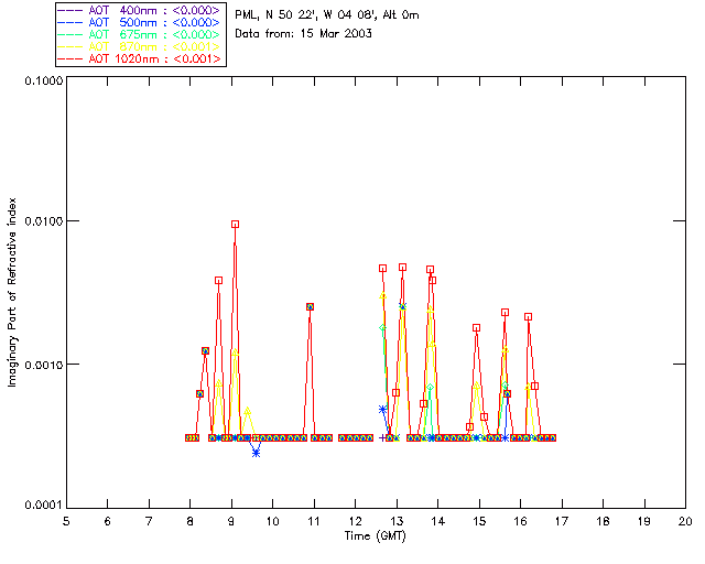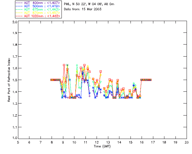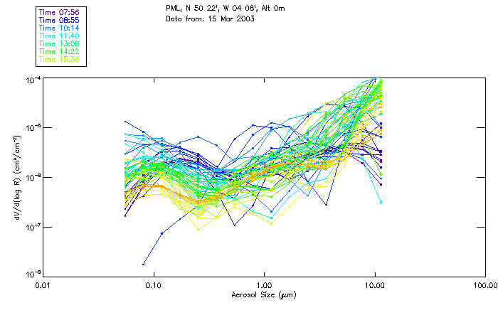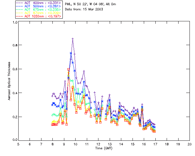 In May 2001 a PREDE POM01-L was installed on the roof of the Plymouth Marine Laboratory to continue the atmospheric correction research of the PML Remote Sensing Group. This was to replace the AERONET CIMEL sunphotometer situated at Rame Head which was decommissioned in 1999. The instrument operates at 7 wavelengths (315, 400, 500, 670, 870, 940 and 1020nm) and scans at pre-set angles away from the solar disk to determine, using the inversion code of Nakajima et al. (2006), various properties of tiny particles called aerosols within the atmospheric column. From these measurements useful atmospheric aerosol parameters such as the Aerosol Optical Thickness (AOT), aerosol size distribution and single scattering albedo can be calculated. Marine aerosols tend to be bigger (D > 1µm) than those generated over the land (0.01 < D < 1µm) and are of a different chemical composition; marine aerosols are salt particles whereas terrestrial aerosols are sulphate compounds.