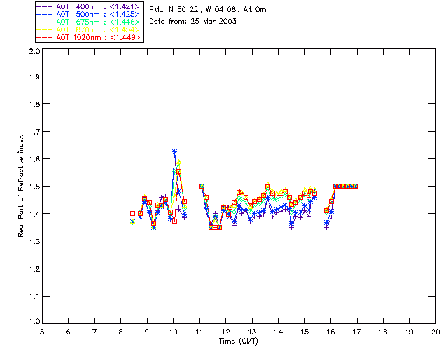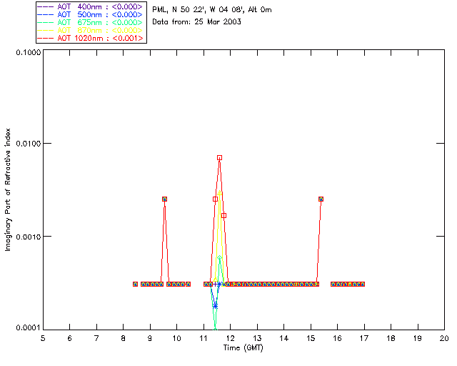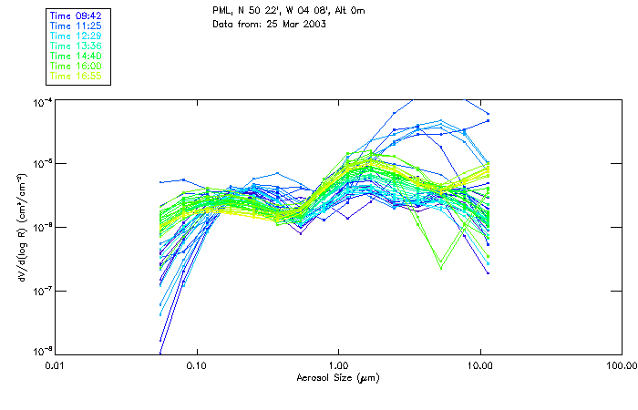 In May 2001 a PREDE POM01-L was installed on the roof of the Plymouth Marine Laboratory to continue the atmospheric correction research of the PML Remote Sensing Group. This was to replace the AERONET CIMEL sunphotometer situated at Rame Head which was decommissioned in 1999. The instrument operates at 7 wavelengths (315, 400, 500, 670, 870, 940 and 1020nm) and scans at pre-set angles away from the solar disk to determine, using the inversion code of Nakajima et al. (2006), various properties of tiny particles called aerosols within the atmospheric column. From these measurements useful atmospheric aerosol parameters such as the Aerosol Optical Thickness (AOT), aerosol size distribution and single scattering albedo can be calculated. Marine aerosols tend to be bigger (D > 1µm) than those generated over the land (0.01 < D < 1µm) and are of a different chemical composition; marine aerosols are salt particles whereas terrestrial aerosols are sulphate compounds.