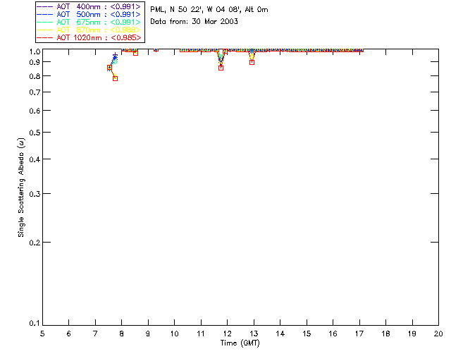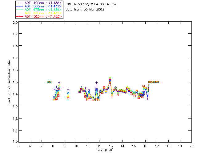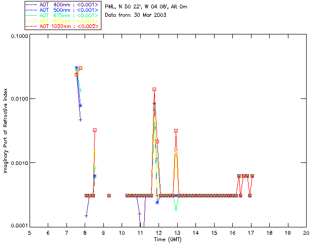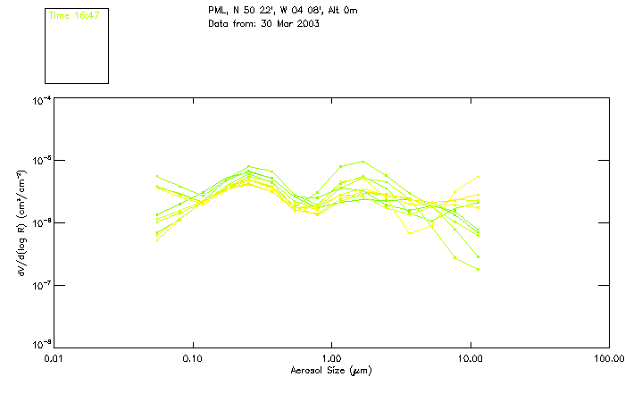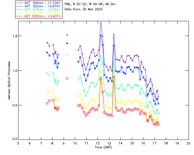 In May 2001 a PREDE POM01-L was installed on the roof of the Plymouth Marine Laboratory to continue the atmospheric correction research of the PML Remote Sensing Group. This was to replace the AERONET CIMEL sunphotometer situated at Rame Head which was decommissioned in 1999. The instrument operates at 7 wavelengths (315, 400, 500, 670, 870, 940 and 1020nm) and scans at pre-set angles away from the solar disk to determine, using the inversion code of Nakajima et al. (2006), various properties of tiny particles called aerosols within the atmospheric column. From these measurements useful atmospheric aerosol parameters such as the Aerosol Optical Thickness (AOT), aerosol size distribution and single scattering albedo can be calculated. Marine aerosols tend to be bigger (D > 1µm) than those generated over the land (0.01 < D < 1µm) and are of a different chemical composition; marine aerosols are salt particles whereas terrestrial aerosols are sulphate compounds.