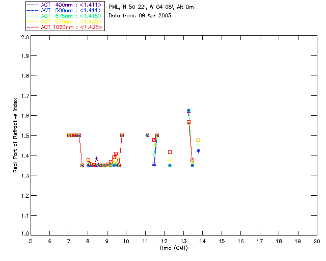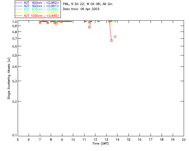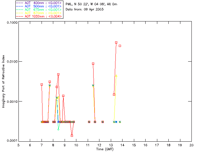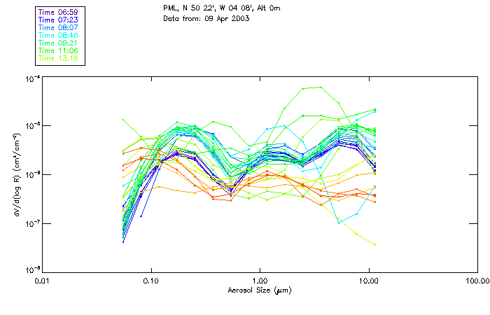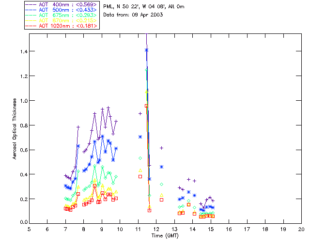 In May 2001 a PREDE POM01-L was installed on the roof of the Plymouth Marine Laboratory to continue the atmospheric correction research of the PML Remote Sensing Group. This was to replace the AERONET CIMEL sunphotometer situated at Rame Head which was decommissioned in 1999. The instrument operates at 7 wavelengths (315, 400, 500, 670, 870, 940 and 1020nm) and scans at pre-set angles away from the solar disk to determine, using the inversion code of Nakajima et al. (2006), various properties of tiny particles called aerosols within the atmospheric column. From these measurements useful atmospheric aerosol parameters such as the Aerosol Optical Thickness (AOT), aerosol size distribution and single scattering albedo can be calculated. Marine aerosols tend to be bigger (D > 1µm) than those generated over the land (0.01 < D < 1µm) and are of a different chemical composition; marine aerosols are salt particles whereas terrestrial aerosols are sulphate compounds.