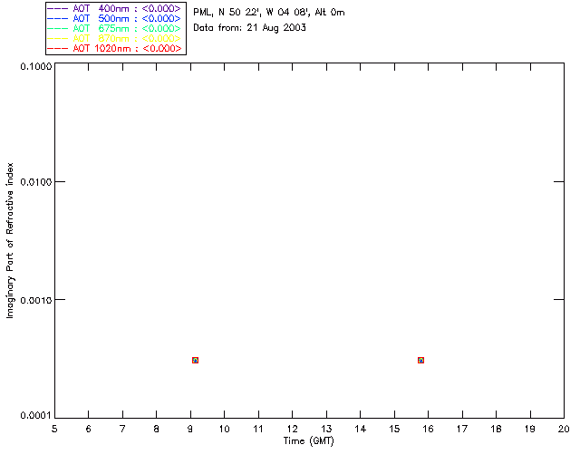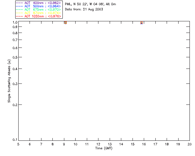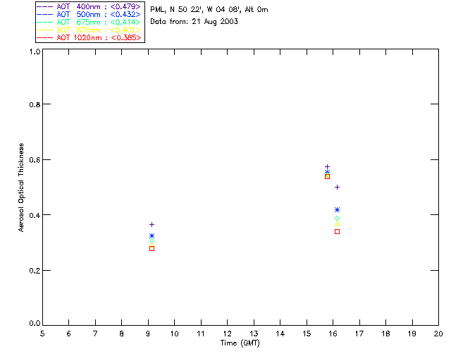In May 2001 a PREDE POM01-L was installed on the roof of the Plymouth Marine Laboratory to continue the atmospheric correction research of the PML Remote Sensing Group. This was to replace the AERONET CIMEL sunphotometer situated at Rame Head which was decommissioned in 1999. The instrument operates at 7 wavelengths (315, 400, 500, 670, 870, 940 and 1020nm) and scans at pre-set angles away from the solar disk to determine, using the inversion code of Nakajima et al. (2006), various properties of tiny particles called aerosols within the atmospheric column. From these measurements useful atmospheric aerosol parameters such as the Aerosol Optical Thickness (AOT), aerosol size distribution and single scattering albedo can be calculated. Marine aerosols tend to be bigger (D > 1µm) than those generated over the land (0.01 < D < 1µm) and are of a different chemical composition; marine aerosols are salt particles whereas terrestrial aerosols are sulphate compounds.