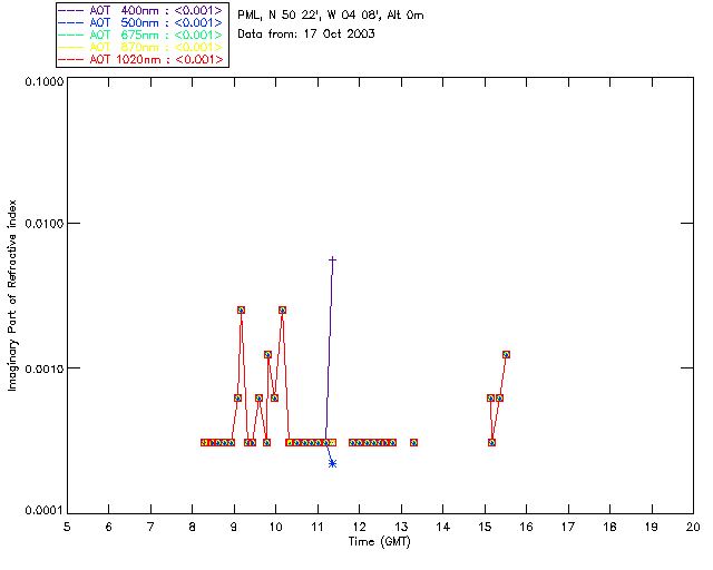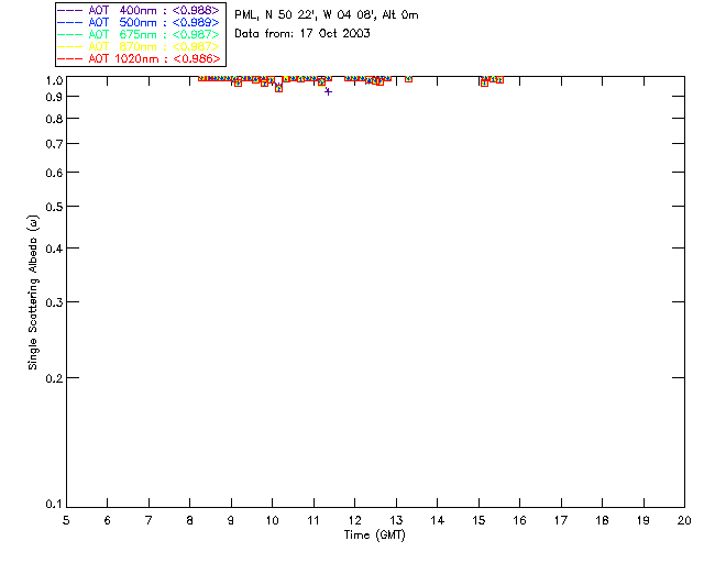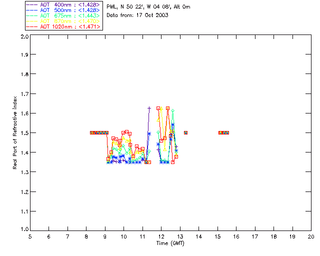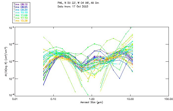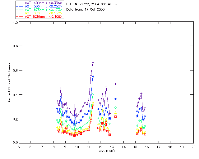 In May 2001 a PREDE POM01-L was installed on the roof of the Plymouth Marine Laboratory to continue the atmospheric correction research of the PML Remote Sensing Group. This was to replace the AERONET CIMEL sunphotometer situated at Rame Head which was decommissioned in 1999. The instrument operates at 7 wavelengths (315, 400, 500, 670, 870, 940 and 1020nm) and scans at pre-set angles away from the solar disk to determine, using the inversion code of Nakajima et al. (2006), various properties of tiny particles called aerosols within the atmospheric column. From these measurements useful atmospheric aerosol parameters such as the Aerosol Optical Thickness (AOT), aerosol size distribution and single scattering albedo can be calculated. Marine aerosols tend to be bigger (D > 1µm) than those generated over the land (0.01 < D < 1µm) and are of a different chemical composition; marine aerosols are salt particles whereas terrestrial aerosols are sulphate compounds.