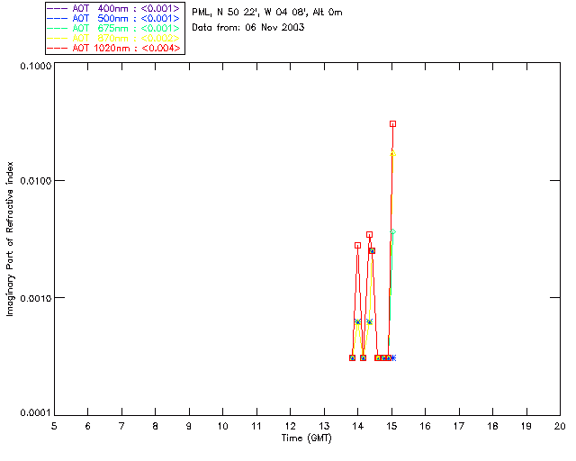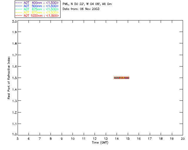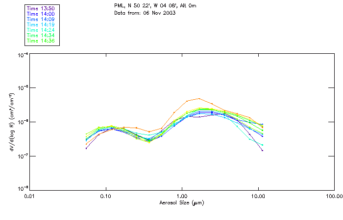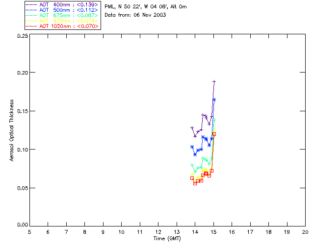 In May 2001 a PREDE POM01-L was installed on the roof of the Plymouth Marine Laboratory to continue the atmospheric correction research of the PML Remote Sensing Group. This was to replace the AERONET CIMEL sunphotometer situated at Rame Head which was decommissioned in 1999. The instrument operates at 7 wavelengths (315, 400, 500, 670, 870, 940 and 1020nm) and scans at pre-set angles away from the solar disk to determine, using the inversion code of Nakajima et al. (2006), various properties of tiny particles called aerosols within the atmospheric column. From these measurements useful atmospheric aerosol parameters such as the Aerosol Optical Thickness (AOT), aerosol size distribution and single scattering albedo can be calculated. Marine aerosols tend to be bigger (D > 1µm) than those generated over the land (0.01 < D < 1µm) and are of a different chemical composition; marine aerosols are salt particles whereas terrestrial aerosols are sulphate compounds.