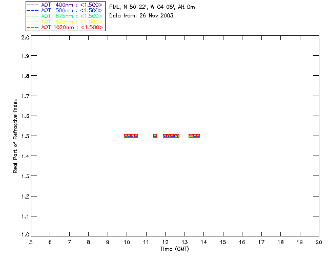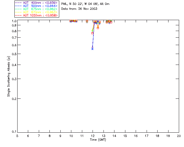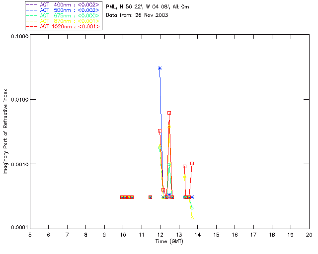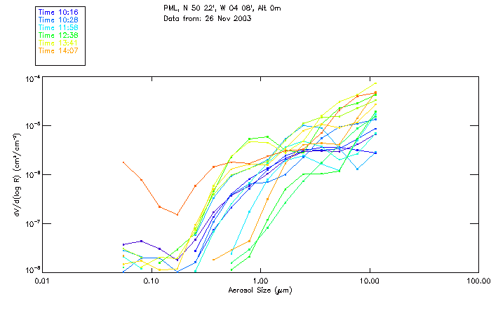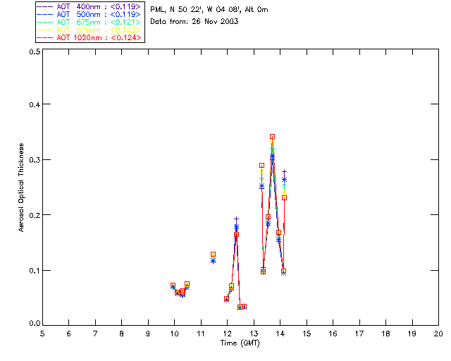 In May 2001 a PREDE POM01-L was installed on the roof of the Plymouth Marine Laboratory to continue the atmospheric correction research of the PML Remote Sensing Group. This was to replace the AERONET CIMEL sunphotometer situated at Rame Head which was decommissioned in 1999. The instrument operates at 7 wavelengths (315, 400, 500, 670, 870, 940 and 1020nm) and scans at pre-set angles away from the solar disk to determine, using the inversion code of Nakajima et al. (2006), various properties of tiny particles called aerosols within the atmospheric column. From these measurements useful atmospheric aerosol parameters such as the Aerosol Optical Thickness (AOT), aerosol size distribution and single scattering albedo can be calculated. Marine aerosols tend to be bigger (D > 1µm) than those generated over the land (0.01 < D < 1µm) and are of a different chemical composition; marine aerosols are salt particles whereas terrestrial aerosols are sulphate compounds.
