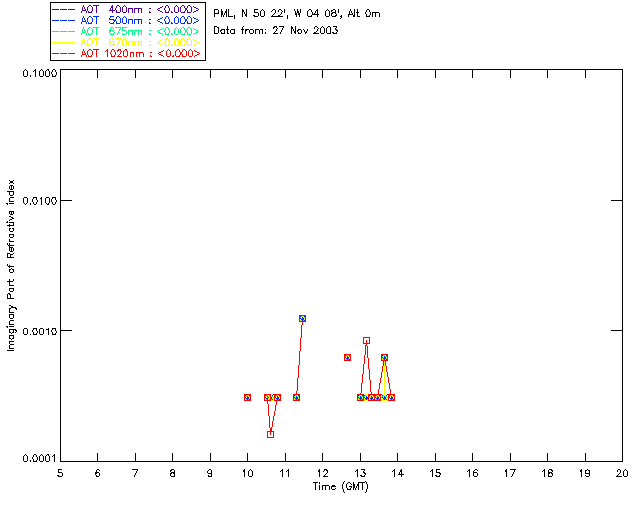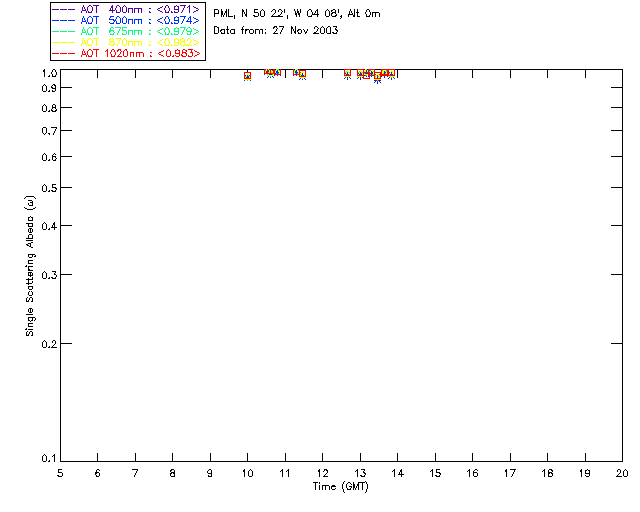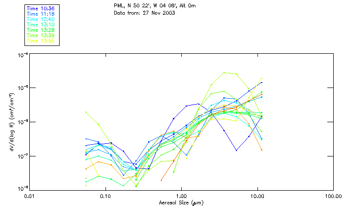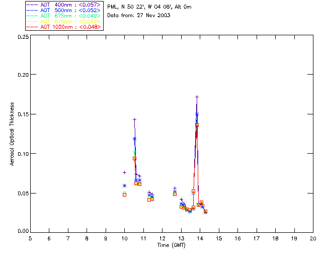 In May 2001 a PREDE POM01-L was installed on the roof of the Plymouth Marine Laboratory to continue the atmospheric correction research of the PML Remote Sensing Group. This was to replace the AERONET CIMEL sunphotometer situated at Rame Head which was decommissioned in 1999. The instrument operates at 7 wavelengths (315, 400, 500, 670, 870, 940 and 1020nm) and scans at pre-set angles away from the solar disk to determine, using the inversion code of Nakajima et al. (2006), various properties of tiny particles called aerosols within the atmospheric column. From these measurements useful atmospheric aerosol parameters such as the Aerosol Optical Thickness (AOT), aerosol size distribution and single scattering albedo can be calculated. Marine aerosols tend to be bigger (D > 1µm) than those generated over the land (0.01 < D < 1µm) and are of a different chemical composition; marine aerosols are salt particles whereas terrestrial aerosols are sulphate compounds.