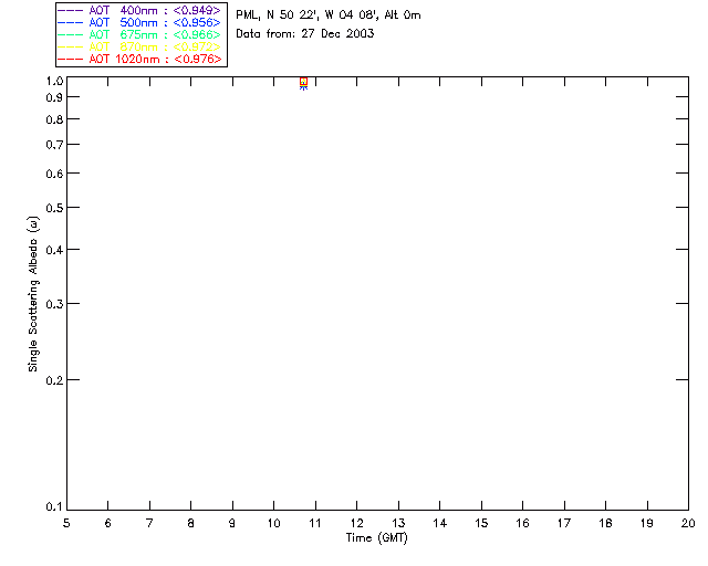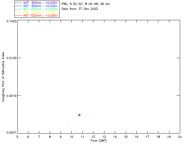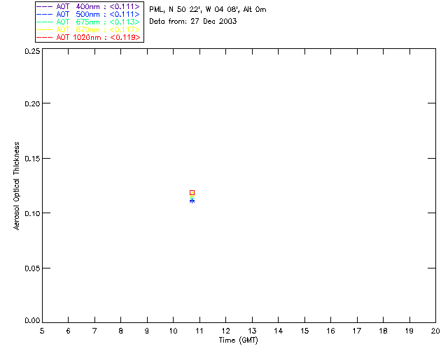 In May 2001 a PREDE POM01-L was installed on the roof of the Plymouth Marine Laboratory to continue the atmospheric correction research of the PML Remote Sensing Group. This was to replace the AERONET CIMEL sunphotometer situated at Rame Head which was decommissioned in 1999. The instrument operates at 7 wavelengths (315, 400, 500, 670, 870, 940 and 1020nm) and scans at pre-set angles away from the solar disk to determine, using the inversion code of Nakajima et al. (2006), various properties of tiny particles called aerosols within the atmospheric column. From these measurements useful atmospheric aerosol parameters such as the Aerosol Optical Thickness (AOT), aerosol size distribution and single scattering albedo can be calculated. Marine aerosols tend to be bigger (D > 1µm) than those generated over the land (0.01 < D < 1µm) and are of a different chemical composition; marine aerosols are salt particles whereas terrestrial aerosols are sulphate compounds.