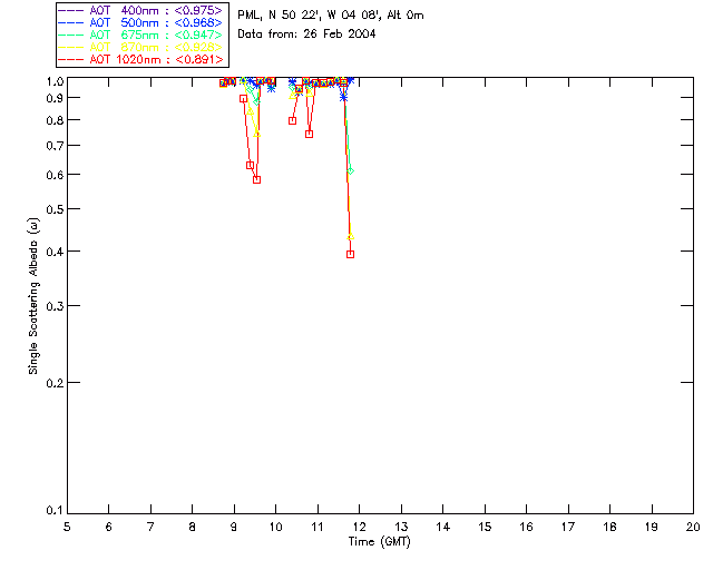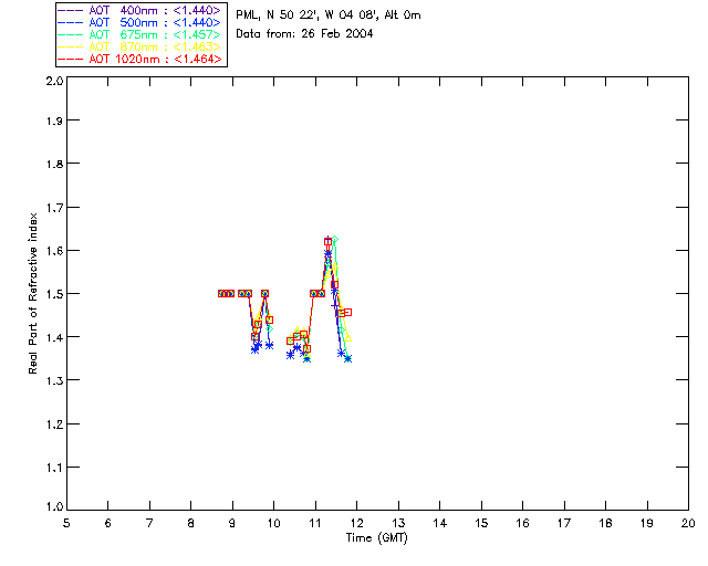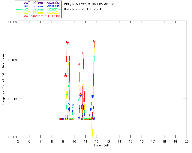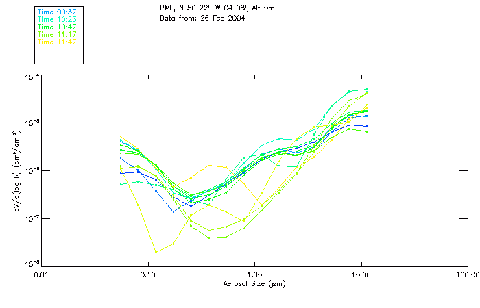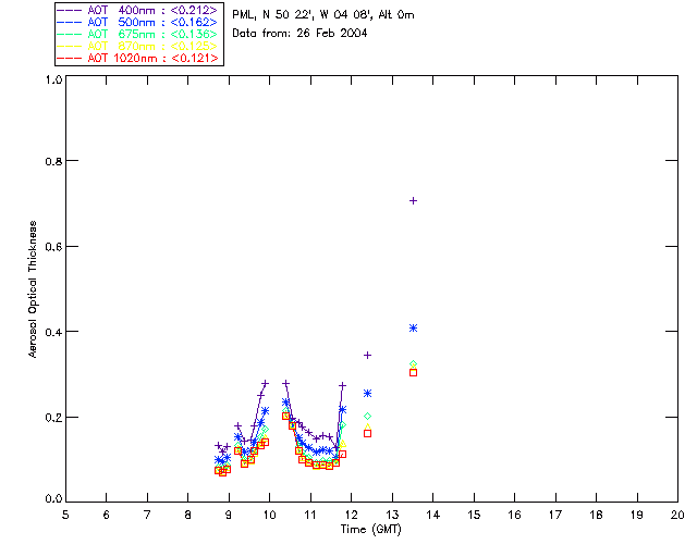 In May 2001 a PREDE POM01-L was installed on the roof of the Plymouth Marine Laboratory to continue the atmospheric correction research of the PML Remote Sensing Group. This was to replace the AERONET CIMEL sunphotometer situated at Rame Head which was decommissioned in 1999. The instrument operates at 7 wavelengths (315, 400, 500, 670, 870, 940 and 1020nm) and scans at pre-set angles away from the solar disk to determine, using the inversion code of Nakajima et al. (2006), various properties of tiny particles called aerosols within the atmospheric column. From these measurements useful atmospheric aerosol parameters such as the Aerosol Optical Thickness (AOT), aerosol size distribution and single scattering albedo can be calculated. Marine aerosols tend to be bigger (D > 1µm) than those generated over the land (0.01 < D < 1µm) and are of a different chemical composition; marine aerosols are salt particles whereas terrestrial aerosols are sulphate compounds.