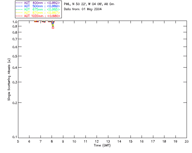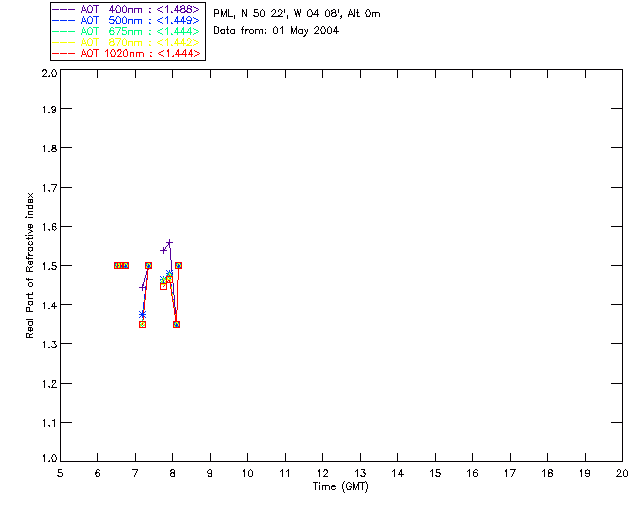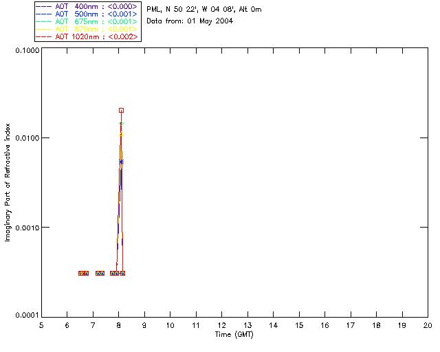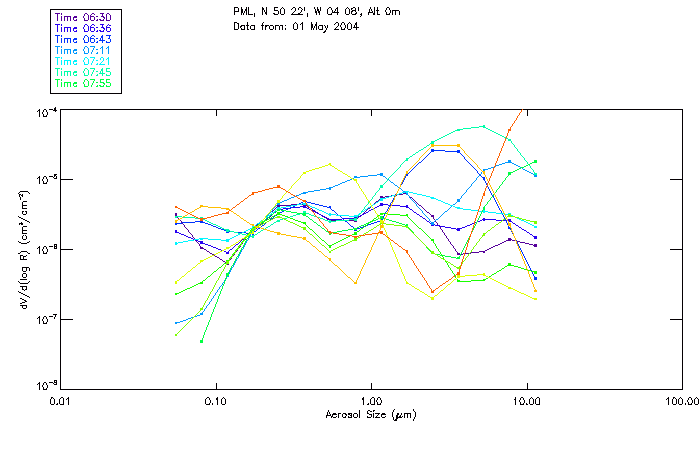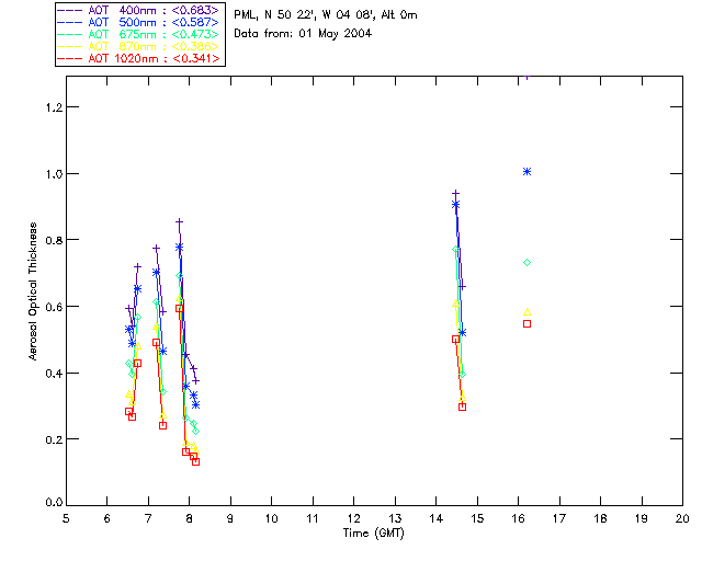 In May 2001 a PREDE POM01-L was installed on the roof of the Plymouth Marine Laboratory to continue the atmospheric correction research of the PML Remote Sensing Group. This was to replace the AERONET CIMEL sunphotometer situated at Rame Head which was decommissioned in 1999. The instrument operates at 7 wavelengths (315, 400, 500, 670, 870, 940 and 1020nm) and scans at pre-set angles away from the solar disk to determine, using the inversion code of Nakajima et al. (2006), various properties of tiny particles called aerosols within the atmospheric column. From these measurements useful atmospheric aerosol parameters such as the Aerosol Optical Thickness (AOT), aerosol size distribution and single scattering albedo can be calculated. Marine aerosols tend to be bigger (D > 1µm) than those generated over the land (0.01 < D < 1µm) and are of a different chemical composition; marine aerosols are salt particles whereas terrestrial aerosols are sulphate compounds.