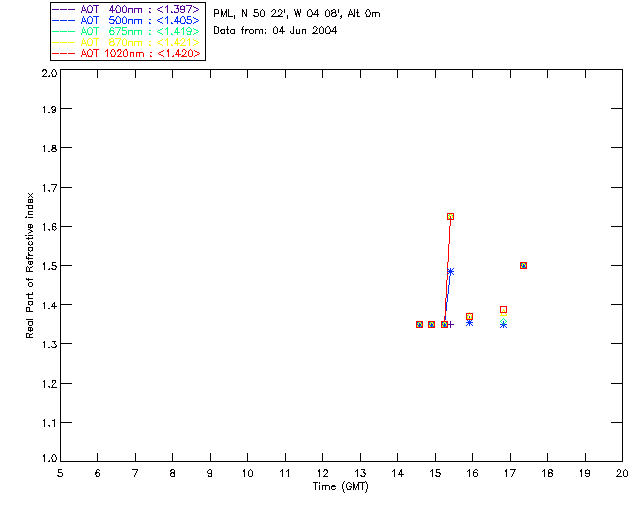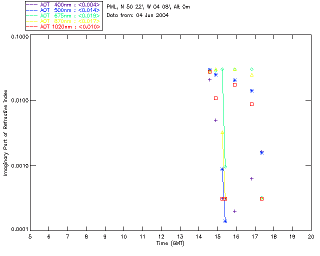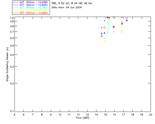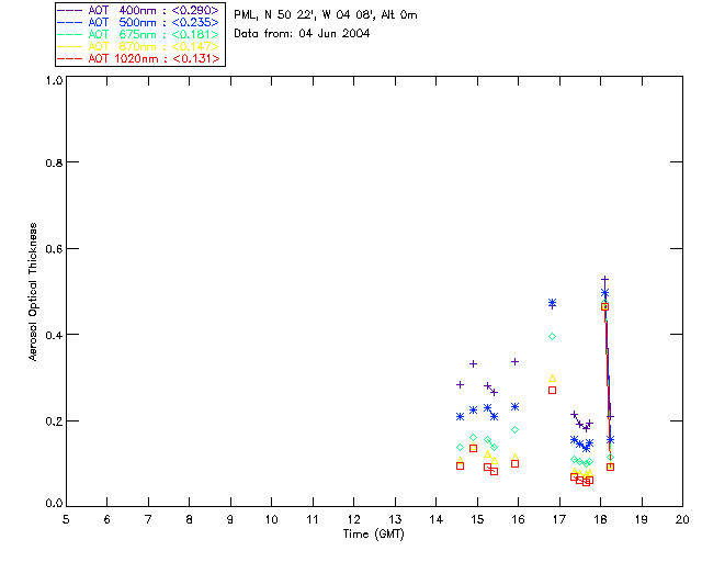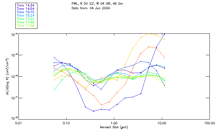 In May 2001 a PREDE POM01-L was installed on the roof of the Plymouth Marine Laboratory to continue the atmospheric correction research of the PML Remote Sensing Group. This was to replace the AERONET CIMEL sunphotometer situated at Rame Head which was decommissioned in 1999. The instrument operates at 7 wavelengths (315, 400, 500, 670, 870, 940 and 1020nm) and scans at pre-set angles away from the solar disk to determine, using the inversion code of Nakajima et al. (2006), various properties of tiny particles called aerosols within the atmospheric column. From these measurements useful atmospheric aerosol parameters such as the Aerosol Optical Thickness (AOT), aerosol size distribution and single scattering albedo can be calculated. Marine aerosols tend to be bigger (D > 1µm) than those generated over the land (0.01 < D < 1µm) and are of a different chemical composition; marine aerosols are salt particles whereas terrestrial aerosols are sulphate compounds.